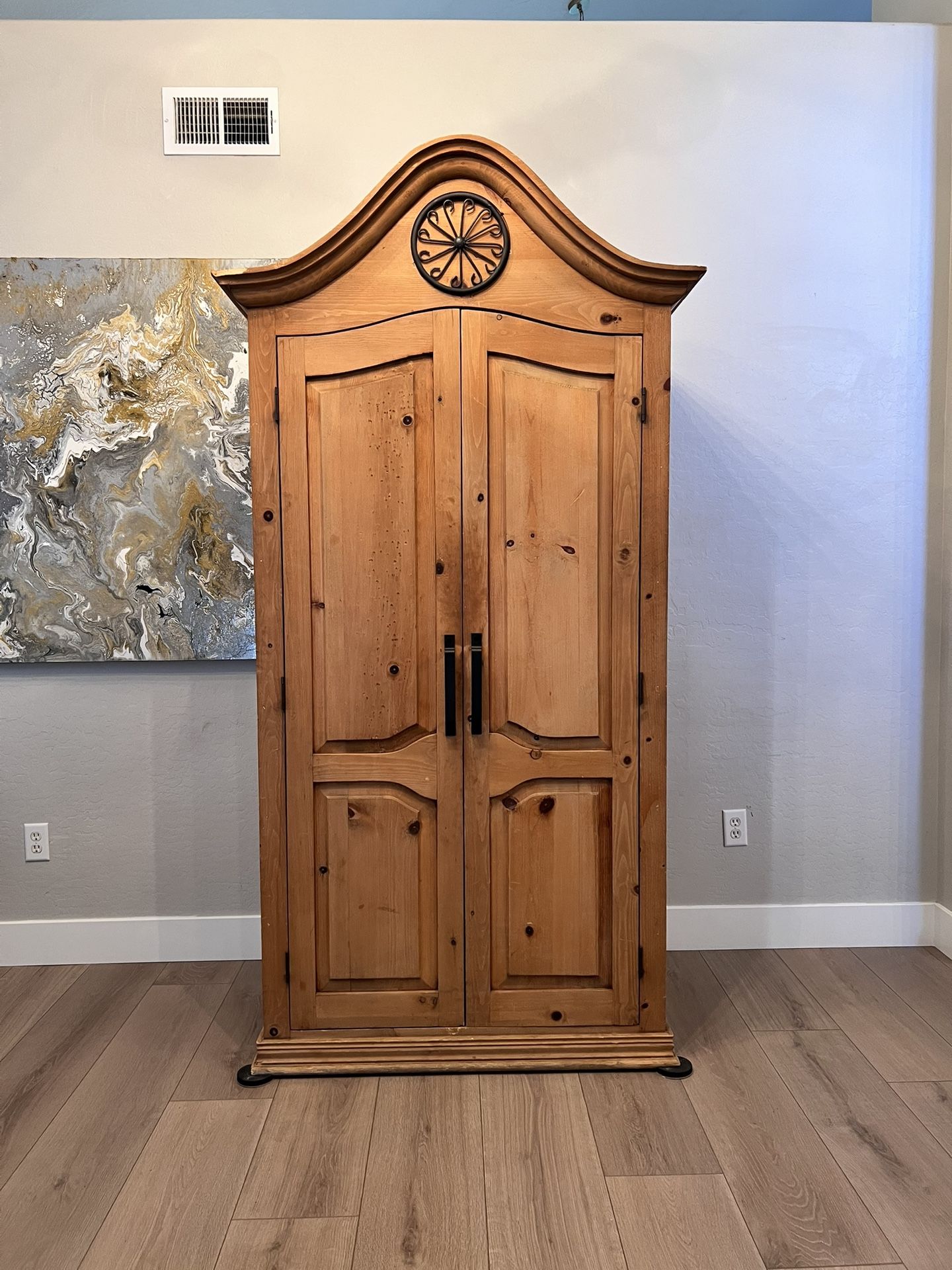 87” Tall Solid Wood Arched Armoire Wardrobe Closet Storage Cabinet w/ 3 Shelves & 2 Drawers- Black Hardware. This piece is stunning! Solid wood gorgeous Rustic Wardrobe cabinet. The hardware as seen around the doors is also an ebony black color. Just replaced the handles with heavy duty barn door handles. Extreme woodworking detail and craftsmanship was used to make this massive cabinet. It even has Solid wood backing! The top is arched for a unique design. The side panels have a frame around edges. Both doors have a beautiful frame with metal latches for doors to close securely. Inside there are two solid wood dovetail drawers that slide smoothly on metal rollers. There are 3 shelves, 2 are adjustable to accommodate your things. This is in near perfect condition especially since it’s vintage! Some minor wear which I love since it makes it rustic. Stunning unique piece! 87.25 height, 44.75 height, width, 26.75 depth Can be used as an armoire, clothespress, chiffonier or chifforobe, cabinet, curio cabinet, Hoosier cabinet, pantry cabinet, display cabinet, hutch cabinet, entryway cabinet, credenza hutch, sideboard, buffet table, dining room server, dining server, kitchen hutch, dining room hutch, liquor cabinet, storage cabinet, entry cabinet, shelving unit, shelf display cabinet, storage hutch, China cabinet, China hutch, prayer unit. I’m also selling multiple household items, furniture, artwork and home decor. Check out my other items items for sale. The more you buy, the more you save!!