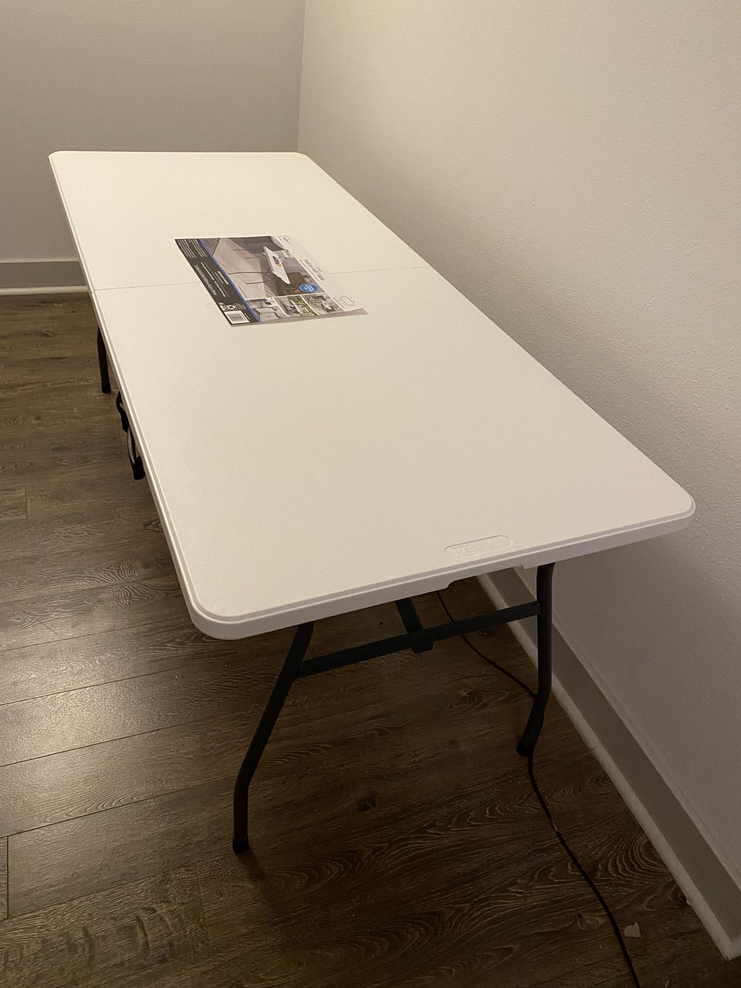 Brand new, never used. They cost $60, but selling mine for $45. Mainstays White 6 Foot Fold-in-Half Table, Indoor and Outdoor. Resistant to scratches, stains and UV Damage. Built-in Carry Handle.