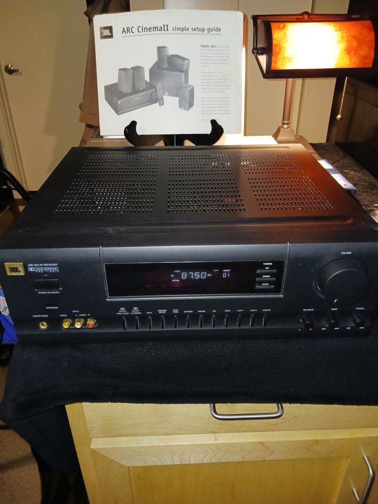 JBL AV receiver with Dolby Digital surround sound front headphone jack video and audio input jack can be used for CD tape VCR DVD AM/FM radio extra loud Bass Matt finished over gloss black bezel fluorescent digital aqua green numbers and letters comes with fully functioning matching JBL remote control and set up guide and papers like new condition never used fresh out of the box! but yet vintage ...asking $175 Now ☆ $120. with remote booklets. Etc no trades cash only please thanks for looking