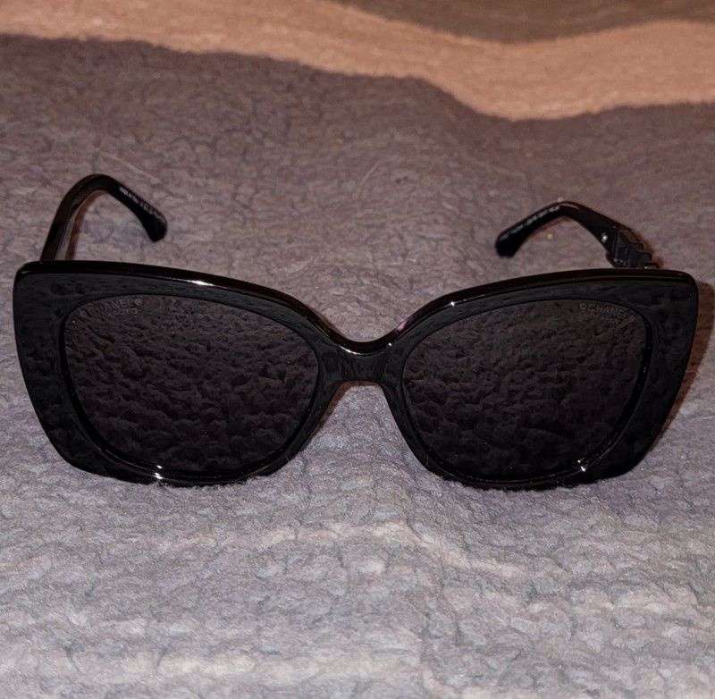 Brand New Worn once Chanel Square sunglasses Black Frames black acetate Chanel Rhinestone Lettering Cutout Authentic Polarized lenses Retail $645 Sold out everywhere! Selling for $450