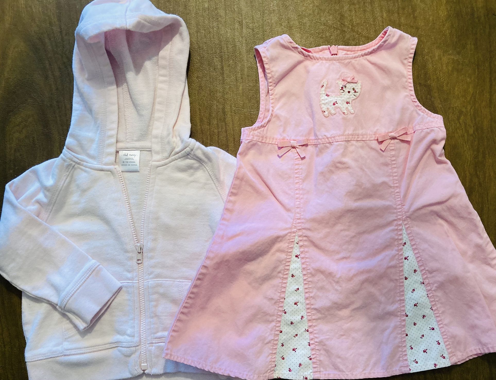1) Never worn pink Gymboree Dress with little kitty at the top and tiny roses inside the white panels. Very pretty. 2) Pink hoodie from Old Navy (notes but great condition)(See other attached photos)