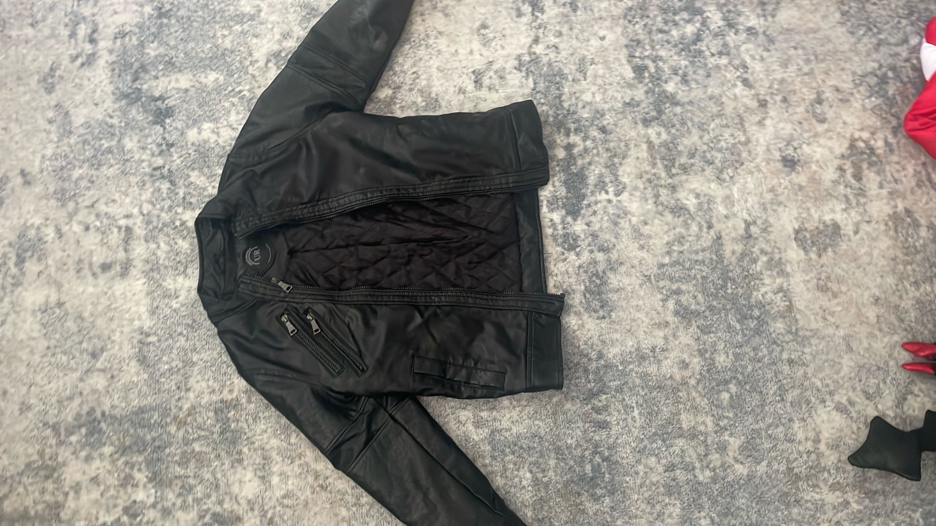 Black leather jacket, for kids. Very high-quality. Comfy.