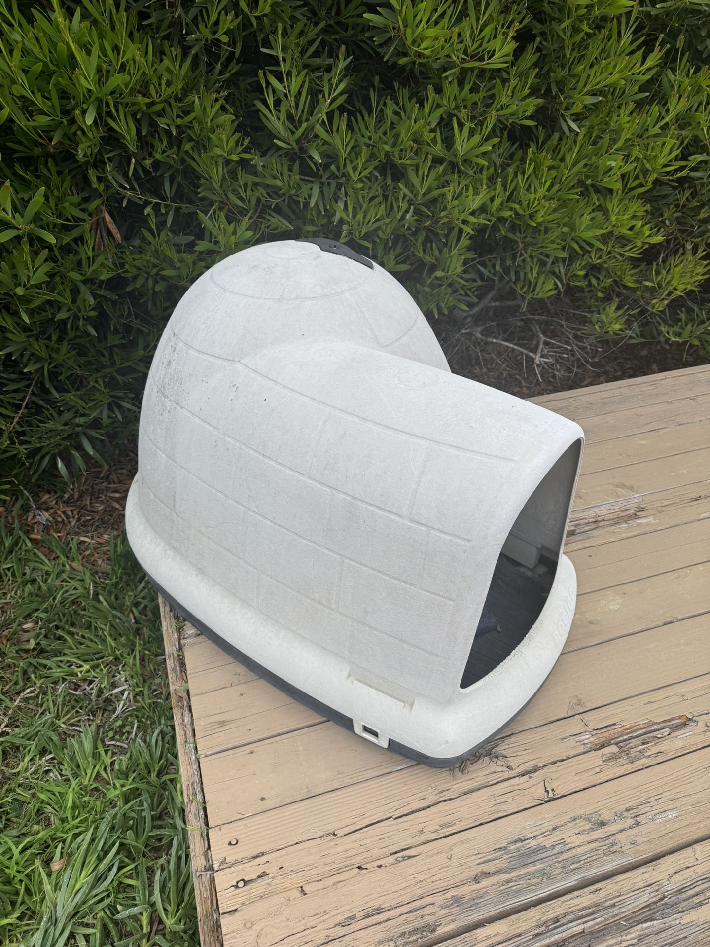 Xl dog gloo 51.5"L x 39.3"W x 30"H Fits XL dog bed inside Great condition and clean looking Two people to carry in my girl opinion Fits in SUV and or truck of course All weather dog house