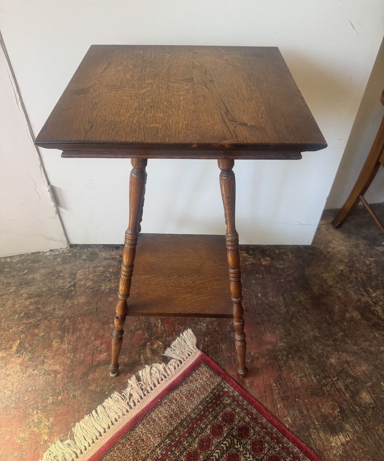 Vintage Oak Parlor Accent / Lamp / Plant TableWith turned legs and a lower shelf for displaying plants or decorative items. Good condition. Length: ~ 16” Depth: ~ 16” Height: ~ 30” 9 1/2 from floor to top of bottom shelf ~ 19” distance between bottom and top shelf Price: $195 CASH ONLY