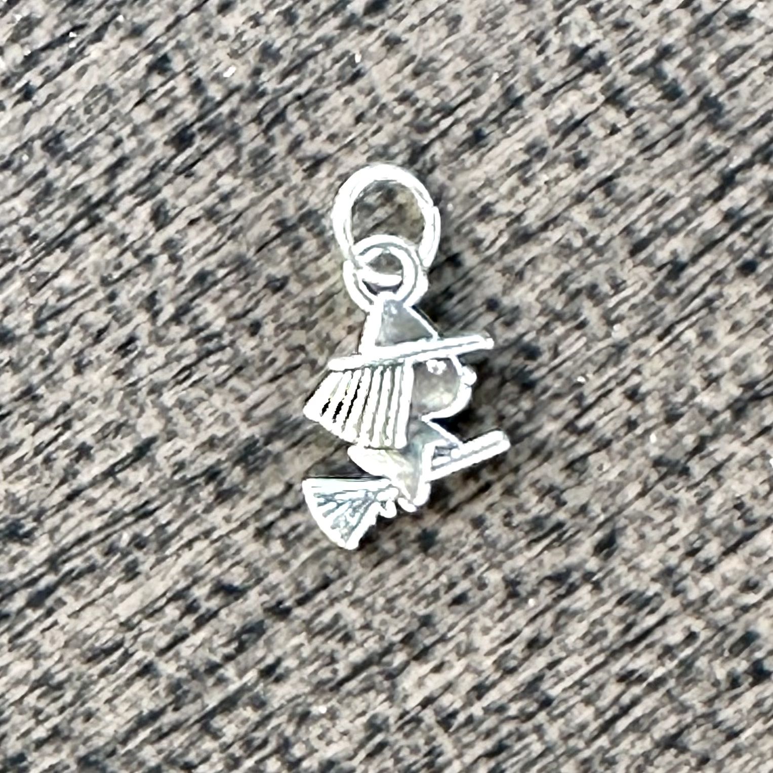 π§ Fun silver tone witch flying on broom stick charm pendant