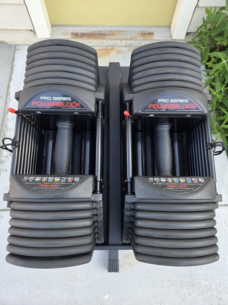 A set of Powerblock Pro Series dumbbells with an 3rd party stand. Each dumbbell adjusts to 90lbs. The plates are coated so they don't make a bunch of noise. The stand would need a small modification to use them at 90lbs, I just never got around to it. Price is OBO.
