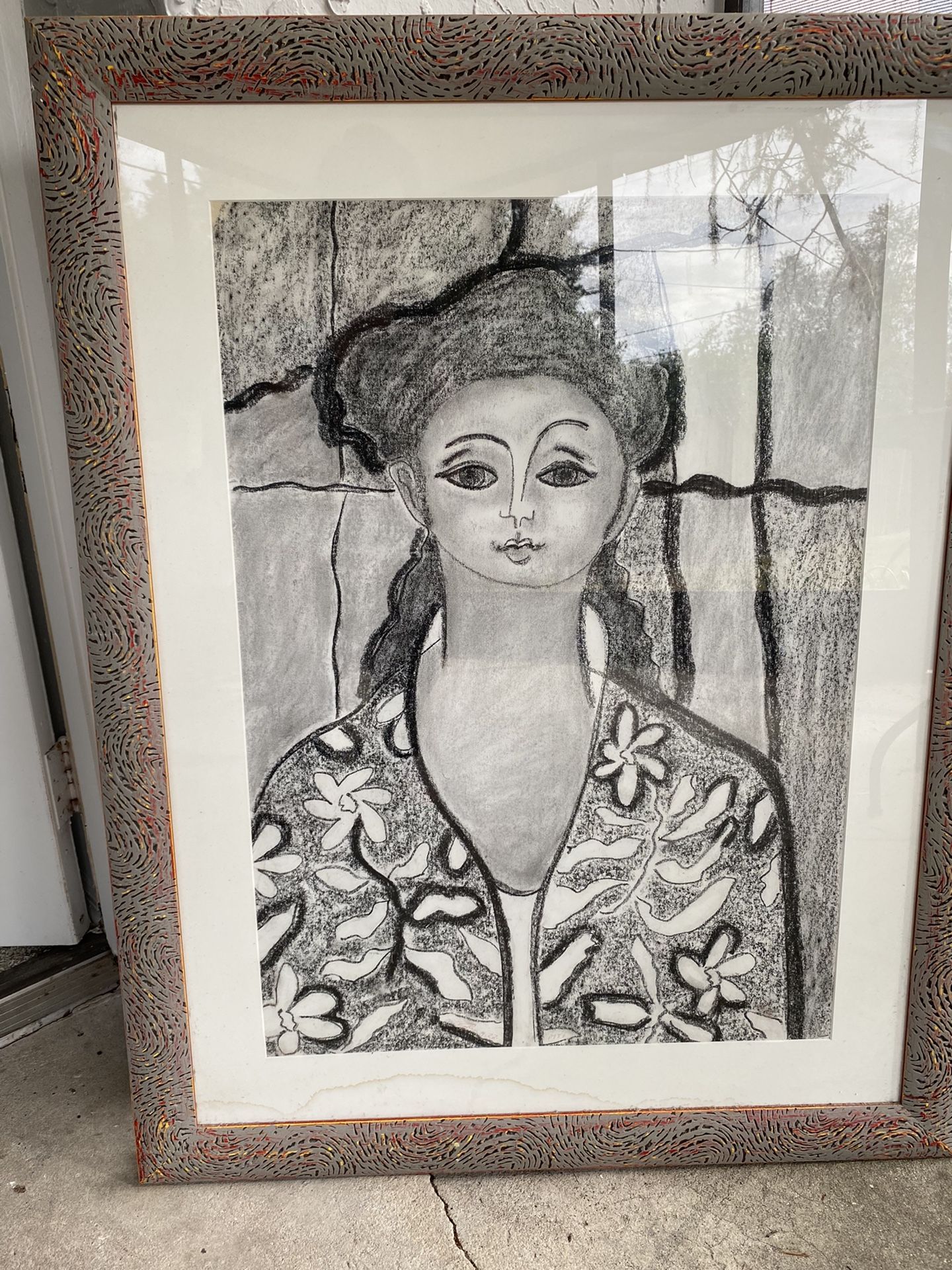 She’s gorgeous. Large piece 31” by 40. The mat suffered a little water damage in my move. I would reframe, but can find a place for her.