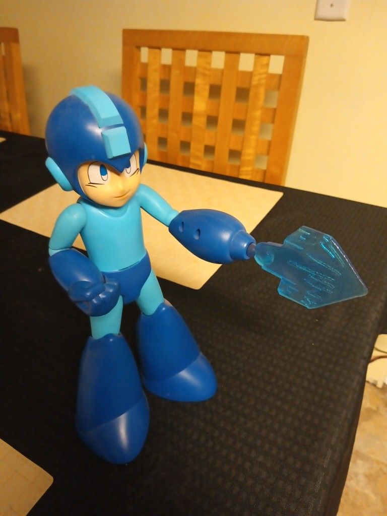I have a mega man 30 anniversary 12 inch collectible. It doesn't have the box and is missing one of the weapon attachments. It is pictured with one but I also have one more not pictured. It makes sounds and is posable.