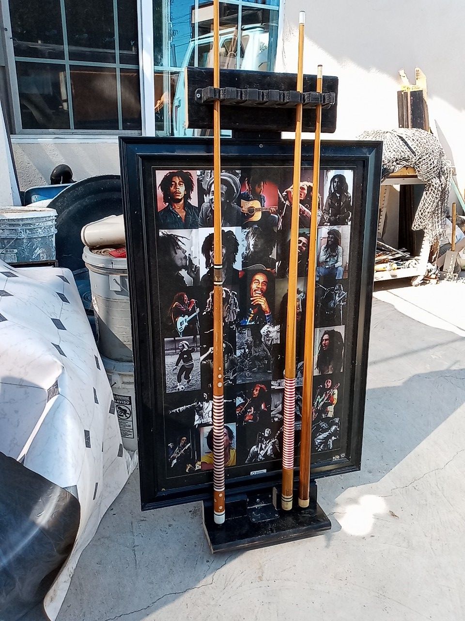 Built myself. Holds six sticks. Poster can be removed. Can be anchored to the floor or hung.