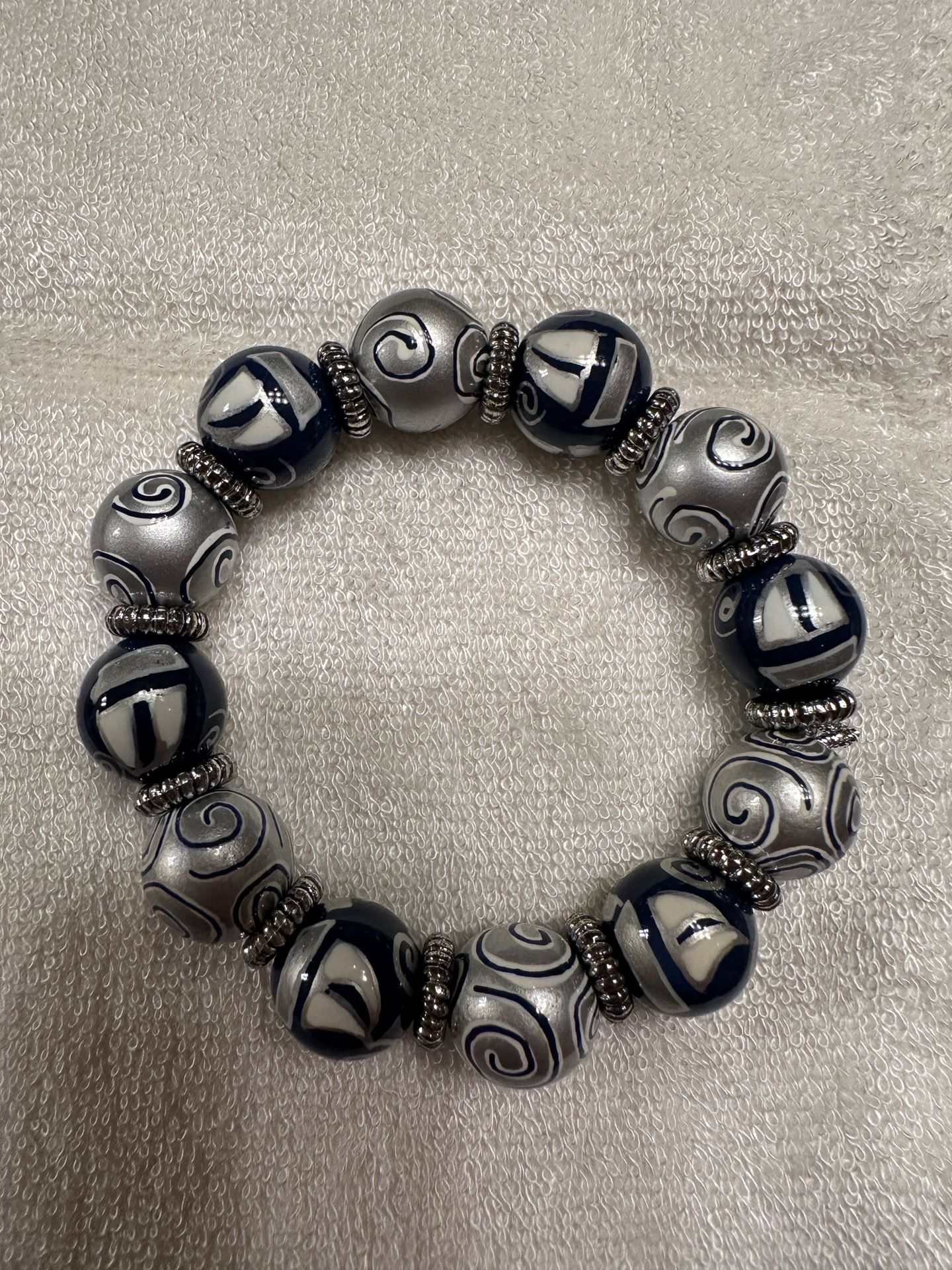 Blue and Silver Boat Themed Beaded Stretch Bracelet, Sailboat Bracelet