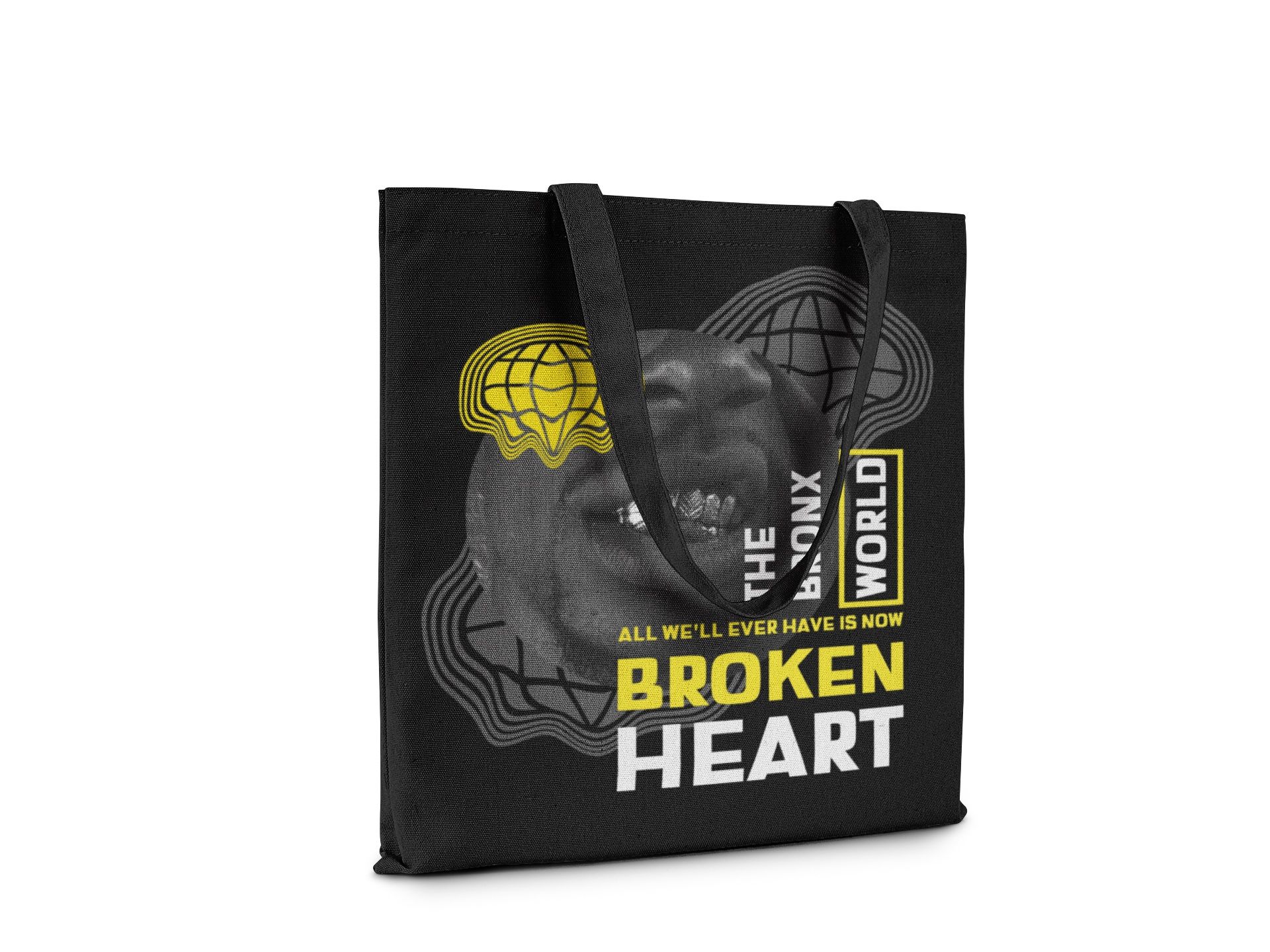 Broken Hearts Reusable Canvas Tote Bag. This stylish Broken Hearts reusable canvas tote combines practicality with bold graphic design. Featuring a striking black background adorned with yellow and white print, this bag makes a statement wherever you go. The eye-catching design includes a distinctive globe graphic and the phrase "All We'll Ever Have Is Now" alongside "Broken Heart" in bold lettering.