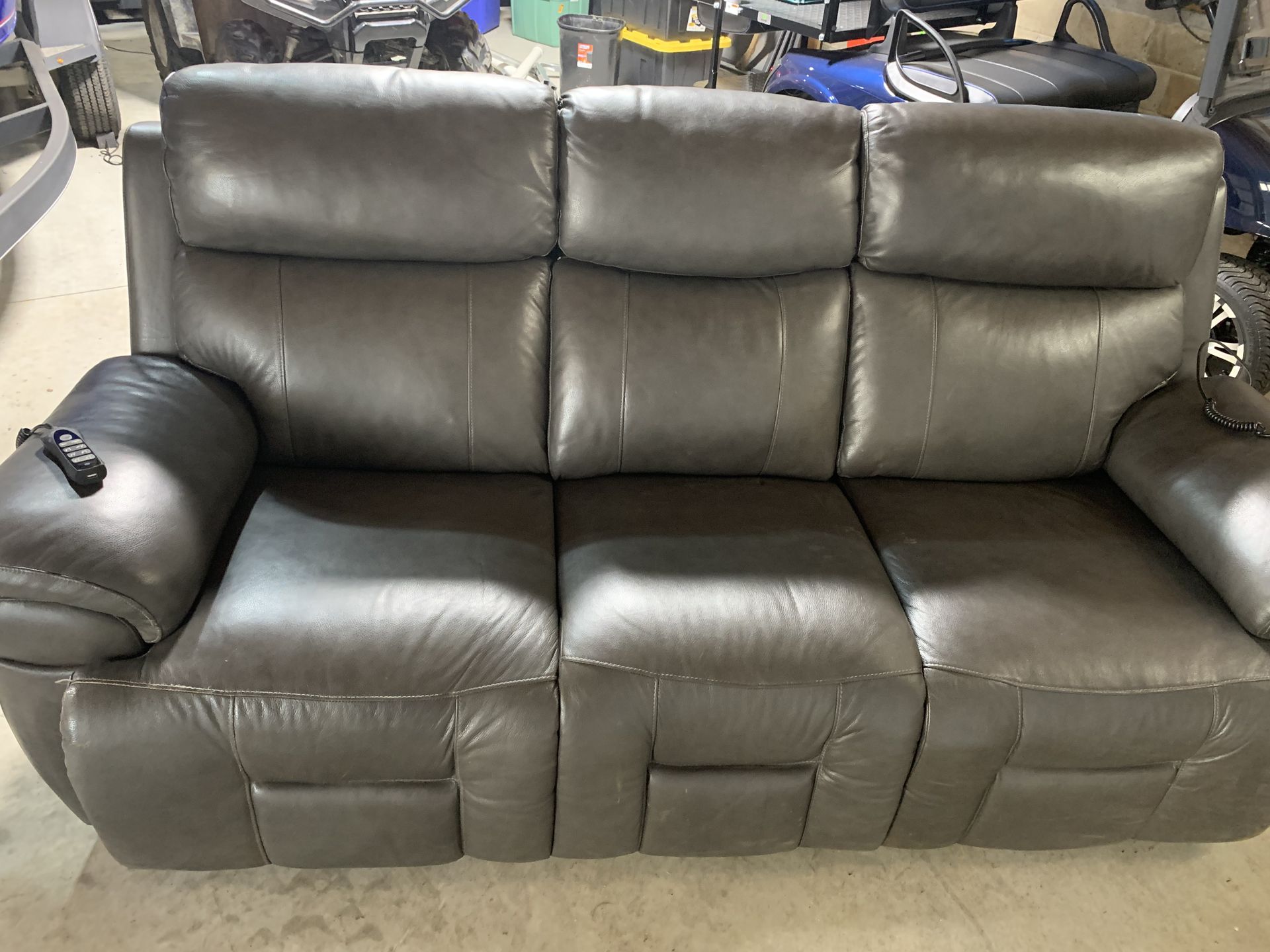 Here is a leather power recliner couch. Powers all the way back for the 2 recliners. It has massage, heat, fully power at any level you want. The center has a light for both directions and phone chargers and cup holders. Like new condition. Non smoker. Bought at Babcock 2 years ago. We wanted rocker recliners instead. Spent $2895 new.