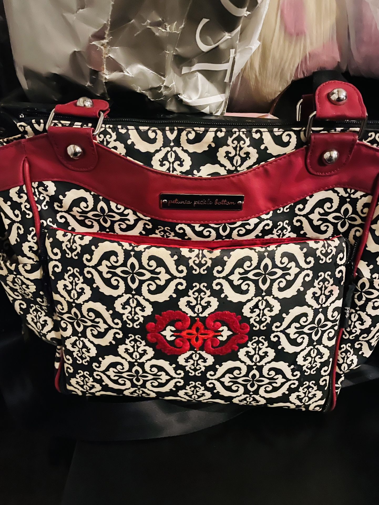 Modern black, white and red petunia pickle bottom diaper bag in great condition.