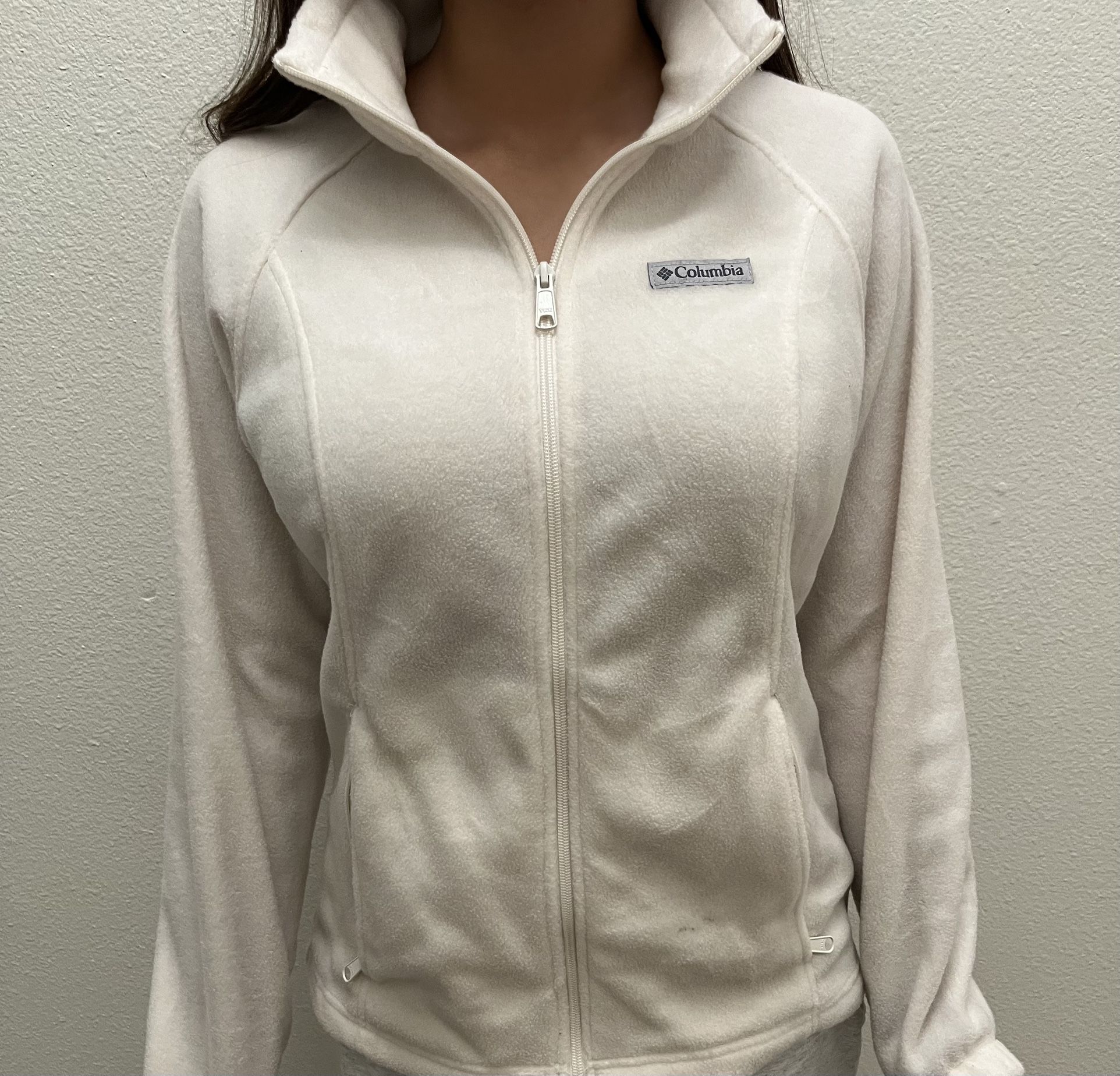 Columbia Sportswear full-zip fleece jacket in a soft cream / off-white color. Lightweight & perfect for layering or everyday wear. Size small