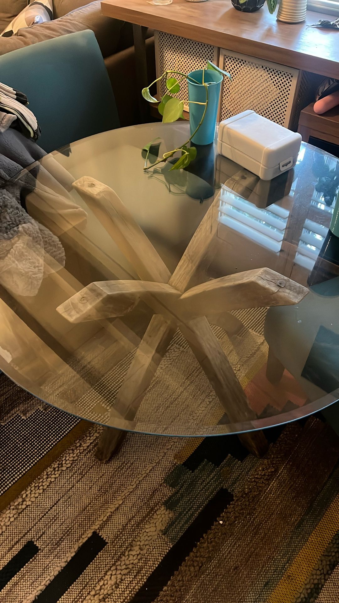 Glass has scratches, just depends if the light catches on. 42 inch diameter. 28.5 inches high