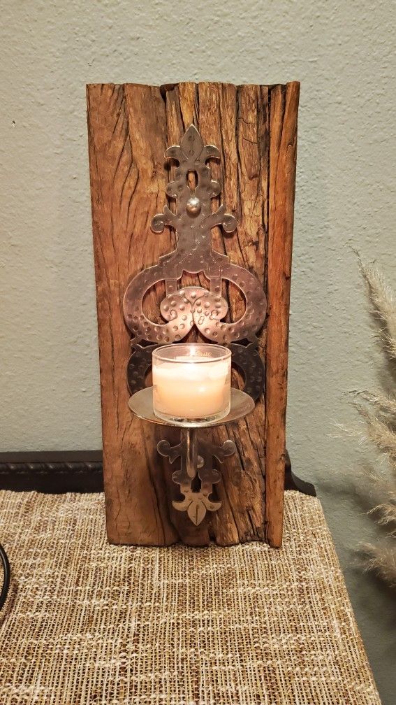 Rustic wall mounted candle holder wall sconce. Made of wood & metal. Would also look nice as a plant holder like a tiny succulent! 14.5" high 6" wide 1.25" deep
