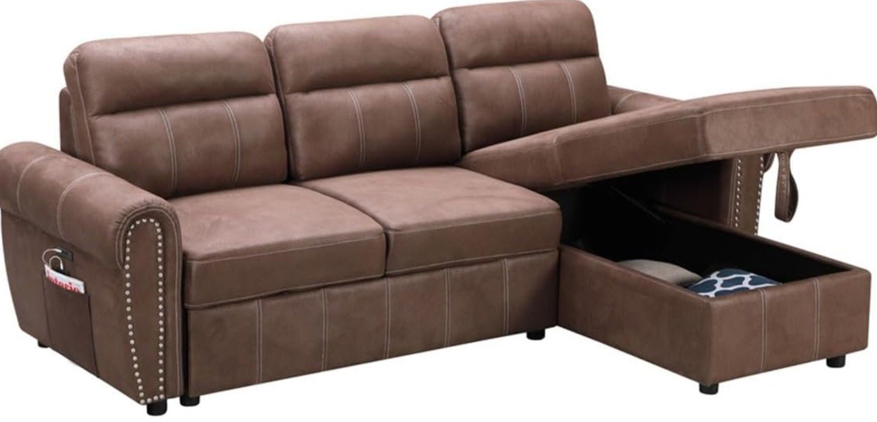 Lilola Home Reversible Sleeper Sectional Sofa Chaise with USB Chargers and Pocket, Brown