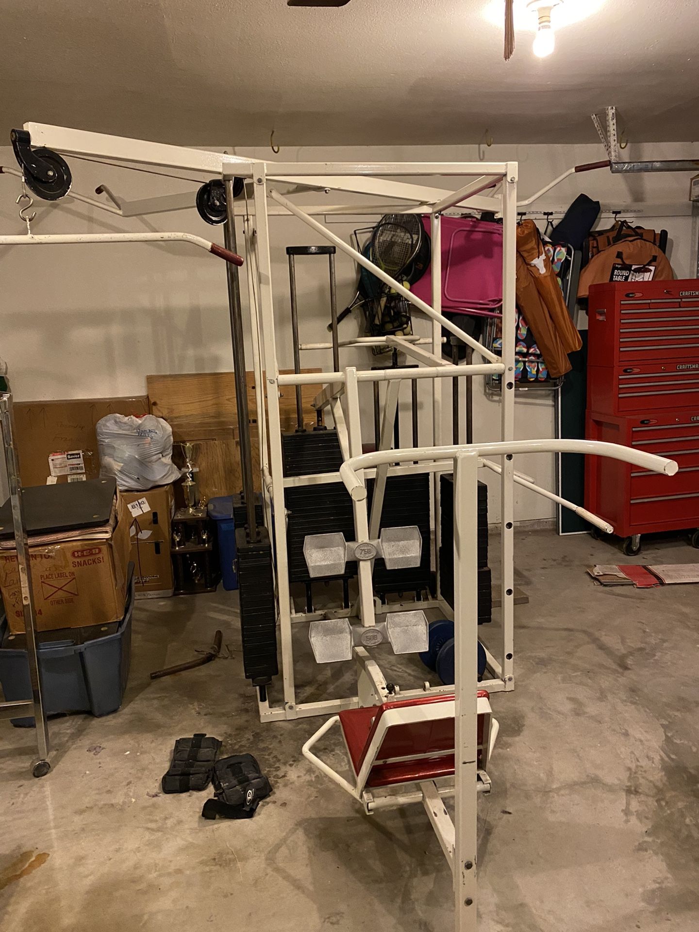 1K lbs of weights Inner stand dimensions 3ft x 40" height 78 1/2 Pull down bar height 83" 2 Pull up bars height 7 ft