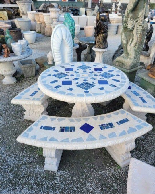 Concrete Mosaic Picnic Table with 3 Benches/ Outdoor Patio Furniture