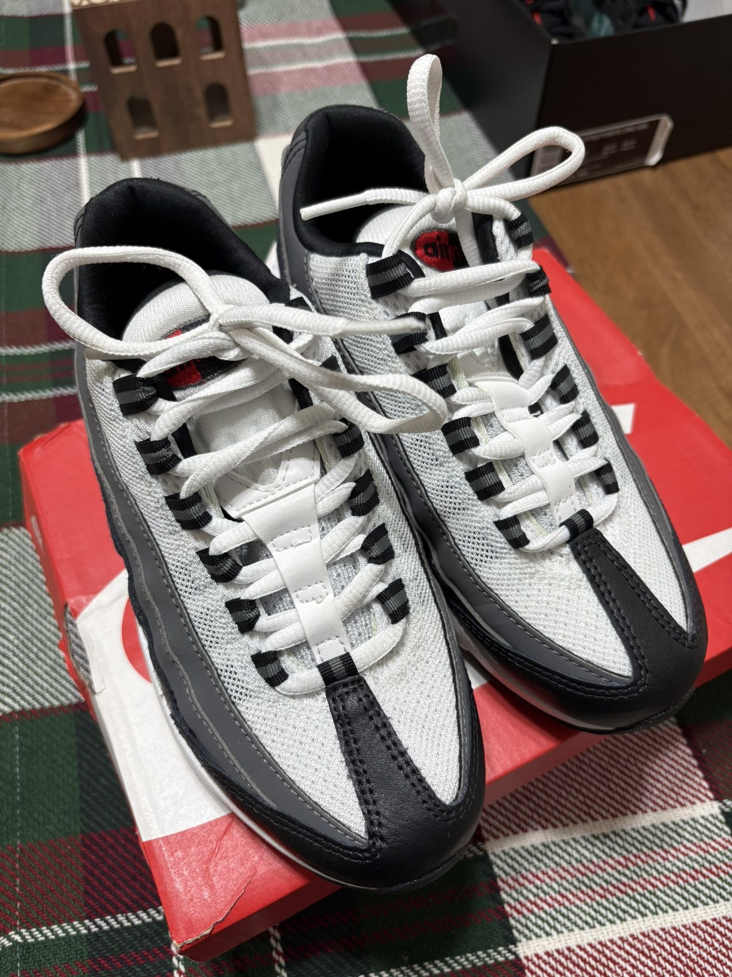 Lightly Used; selling this pair of Nike Air Max 95 GS 5Y Recraft sneakers in the white, black, and grey colorway with red accents for $95 OBO