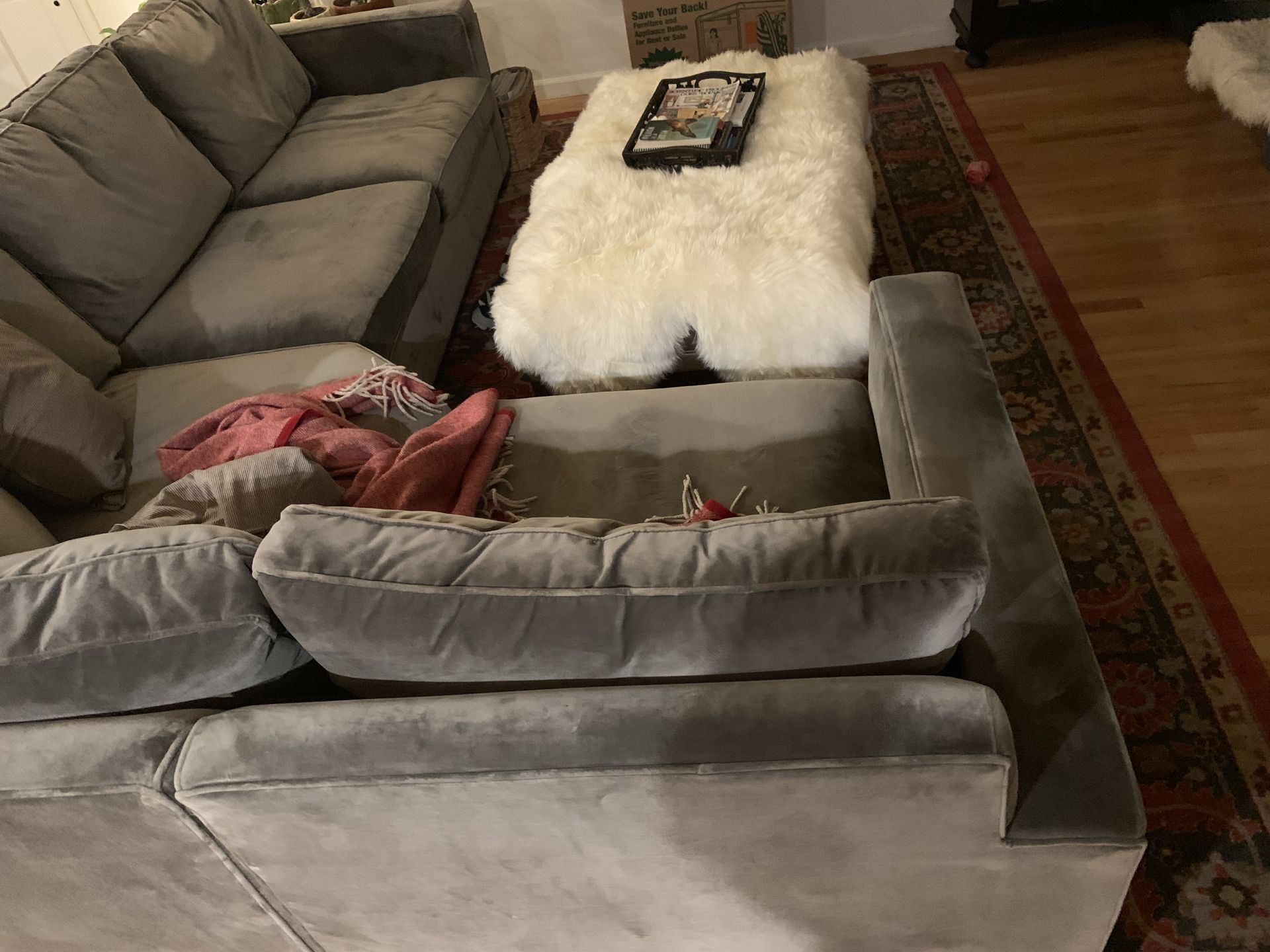 Fair condition. A few blemishes. Was professionally cleaned last summer. Cushions and couch are very sturdy. Grey velvet fabric. Easy to clean.