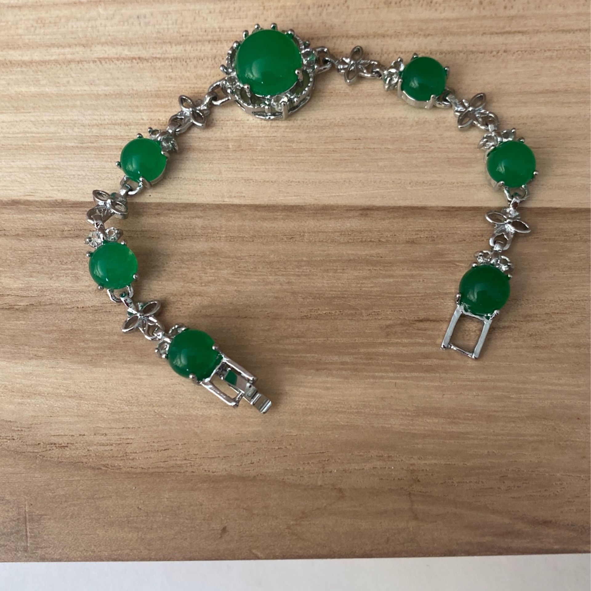 Silver plated natural green jade bracelets  Inlaid with white zircon 7 inches long