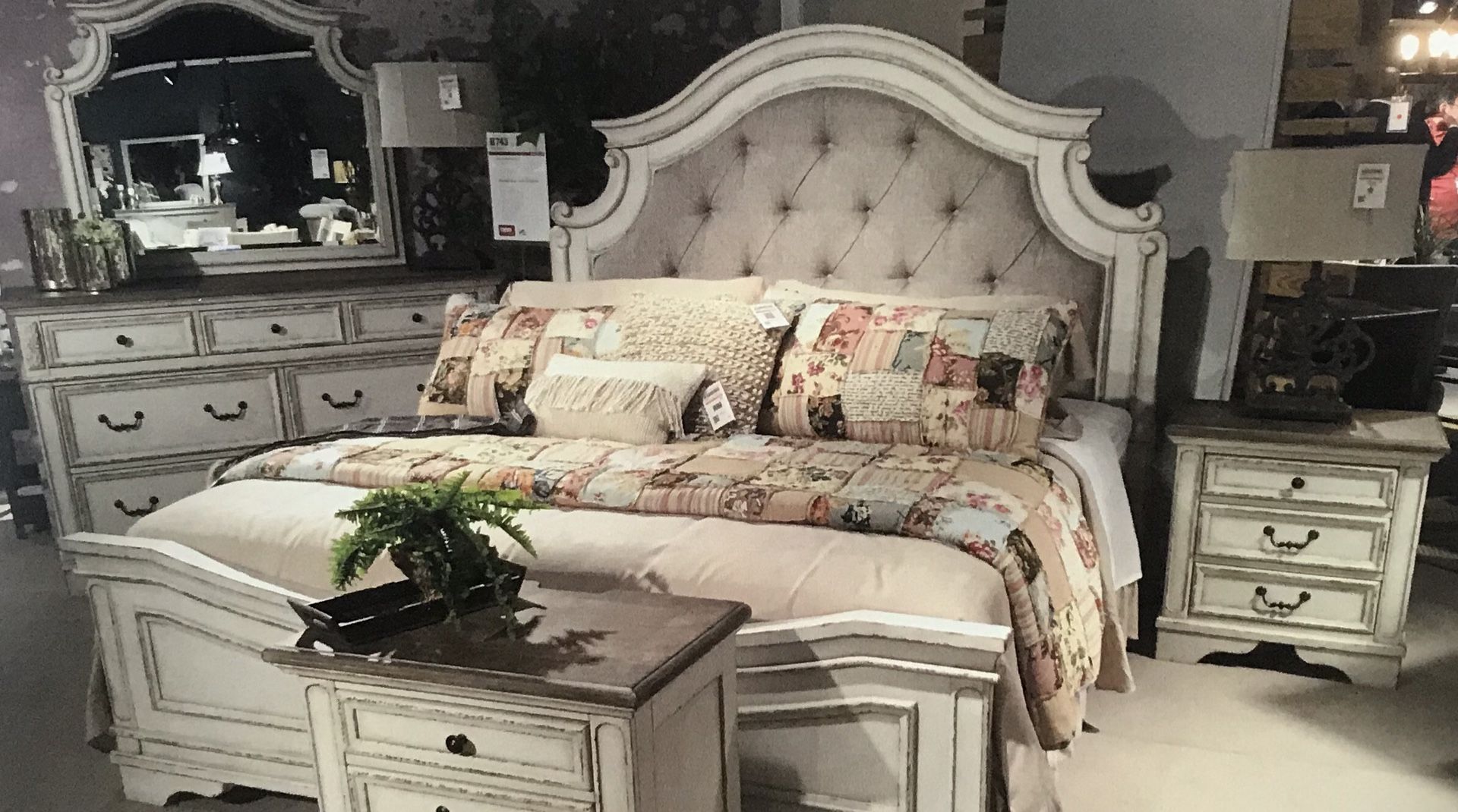 ****AMAZING DEAL**** Brand New Queen Bedroom Set for Only $1699 Set Includes Queen Bed, Nightstand, Dresser & Mirror (Mattress Sold Separately) Solid Wood Antique Two Tone Finish Chipped White Finish Distressed Wood Finished Tops Framed Drawer Fronts Overlay Decorative Corbels Ornately Shaped Headboard with Inset Upholstered Cushion Matching Mirror Frame Ball Bearing Side Drawer Guides Dual USB Ports in Nightstand Perfect for a traditional cottage designed bedroom. Hablamos tu idioma Come See Us @ Zoe’s Furniture In Richardson, Texas Only!!! Seven Four Three. Ten Six Five. CS