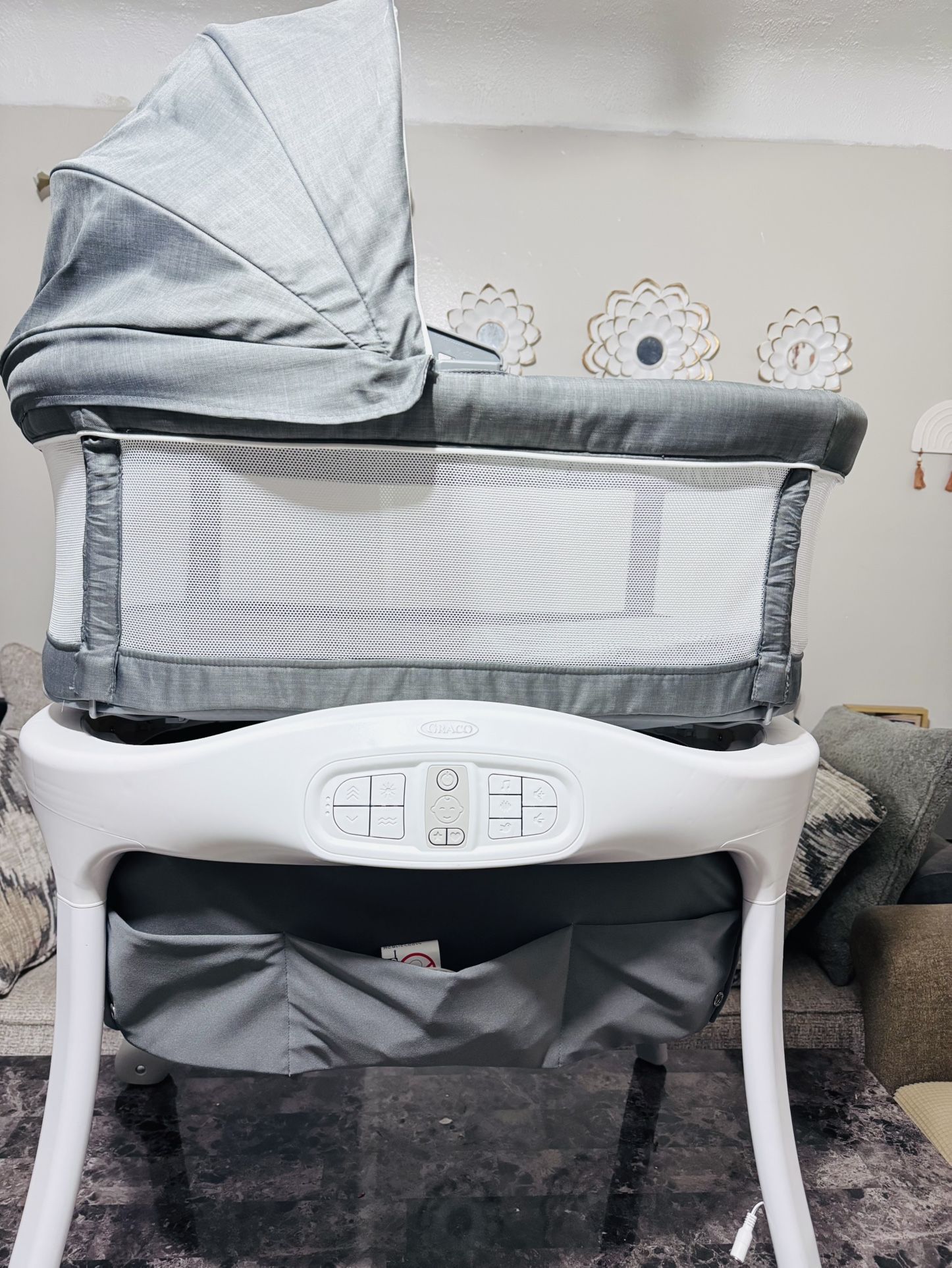 For an unknown reason the Cry Detection Technology suddenly stopped working. PRICE NEGOTIABLE The bassinet could be rocked by hand Used for less then 4 months Comes with its washable mattress In a pretty good condition Graco Sense2Snooze Bassinet