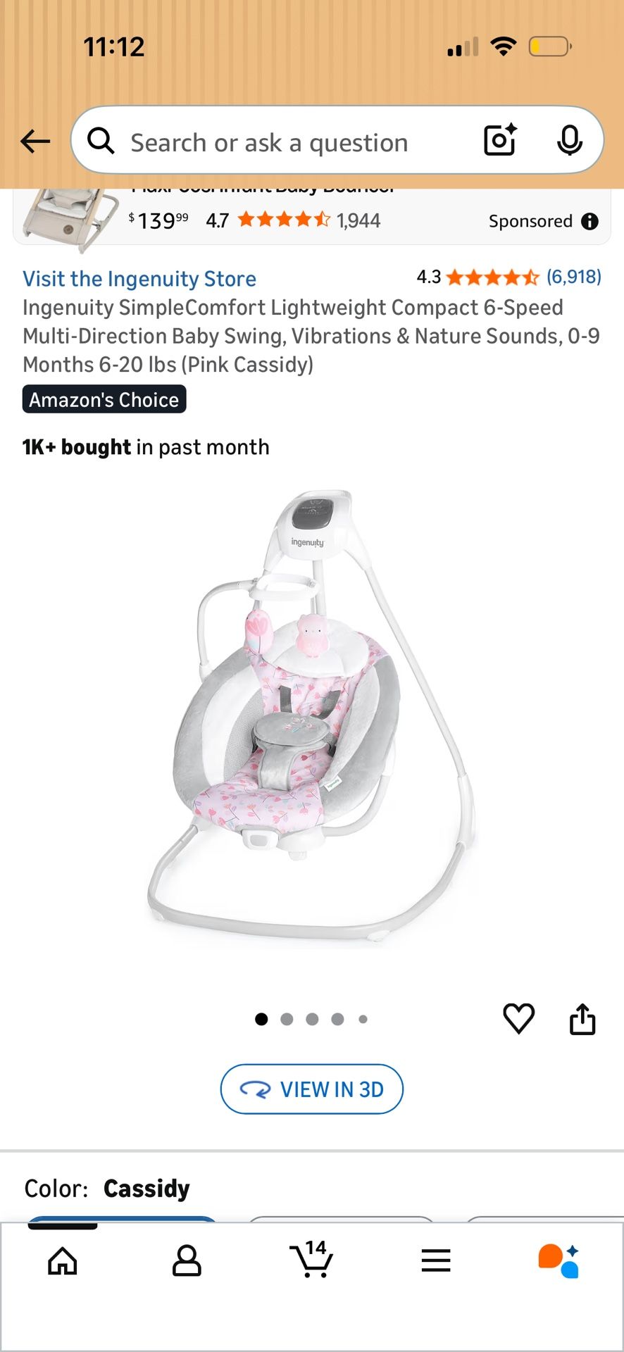 Ingenuity SimpleComfort 6-Speed Baby Swing Pink Gray Vibration Nature Sounds