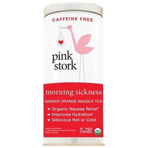 100% organic and natural remedy for morning sickness Caffeine-free ginger-peach tea, great hot or iced! 8 bags remaining out of 10 Settles your stomach, relieves symptoms of hyperemesis gravidarum, and eases nausea Amplified medicinal properties due to organic ingredients and biodegradable pyramid design Pink Stork's Morning Sickness Relief Tea is more than a natural remedy for morning sickness - with ginger and ceylon black tea, our hydrating drink settles your stomach, eases nausea, relaxes the intestinal tract (promoting relief from cramps, constipation, diarrhea and motion sickness) and even relieves symptoms of hyperemesis gravidarum! Thanks to organic ingredients and our biodegradable pyramid tea sachet, you get larger portions of our yummy tea and organic ginger than a traditional teabag - the health benefits are amplified for faster, more effective results. Whether you're curling up with a warm mug or prefer a tasty peach iced tea - our blend is perfect hot or cold! Simply boil 8oz of water and pour over a sachet of tea, steep for five minutes, and enjoy up to 2 cups from one sachet. Or steep 3 sachets of tea with 6 cups of water in a warm teapot and let it sit for 30 minutes or so - your tea can be stored in the refrigerator and enjoyed over ice, or warmed in the microwave, and you can sip on it all day to keep nausea at bay. Pink Stork Tea relieves morning sickness with 100% organic ginger and ceylon black tea - it settles nausea and reduces symptoms of hyperemesis gravidarum! Curl up with a warm mug or enjoy your iced ginger-peach tea all day for optimal relief. Pink Stork is the go-to brand for women who need safe, effective and natural pregnancy support! Contains: Does not contain any of the 8 major allergens Tea Type: Non-caffeinated Store: In a Dry location at Room temperature Exterior Container: Metal Tin Form: Loose State of Readiness: Mix Servings: Approximate Net weight: 1.4 ounces Package type: Multi-pack single servings
