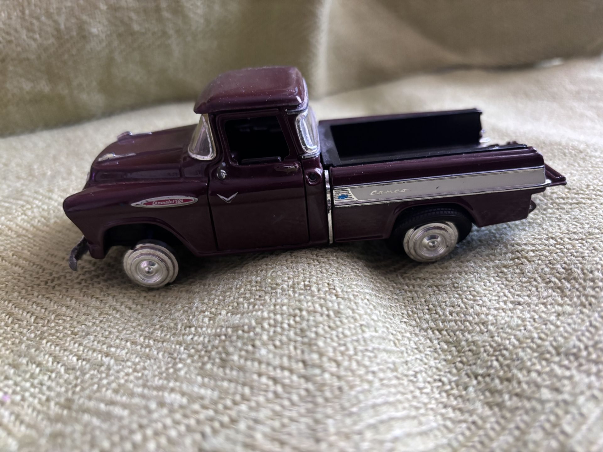 1957 Chevrolet Cameo pickup truck Toy Model. die-cast model of a 1957 Chevrolet Cameo pickup truck. It is about 5.25” long. It is around a 1:24 scale. It’s made from die-cast metal. The truck is finished in a burgundy color. It features a white side stripe and the "Chevrolet" script emblem on the fender.