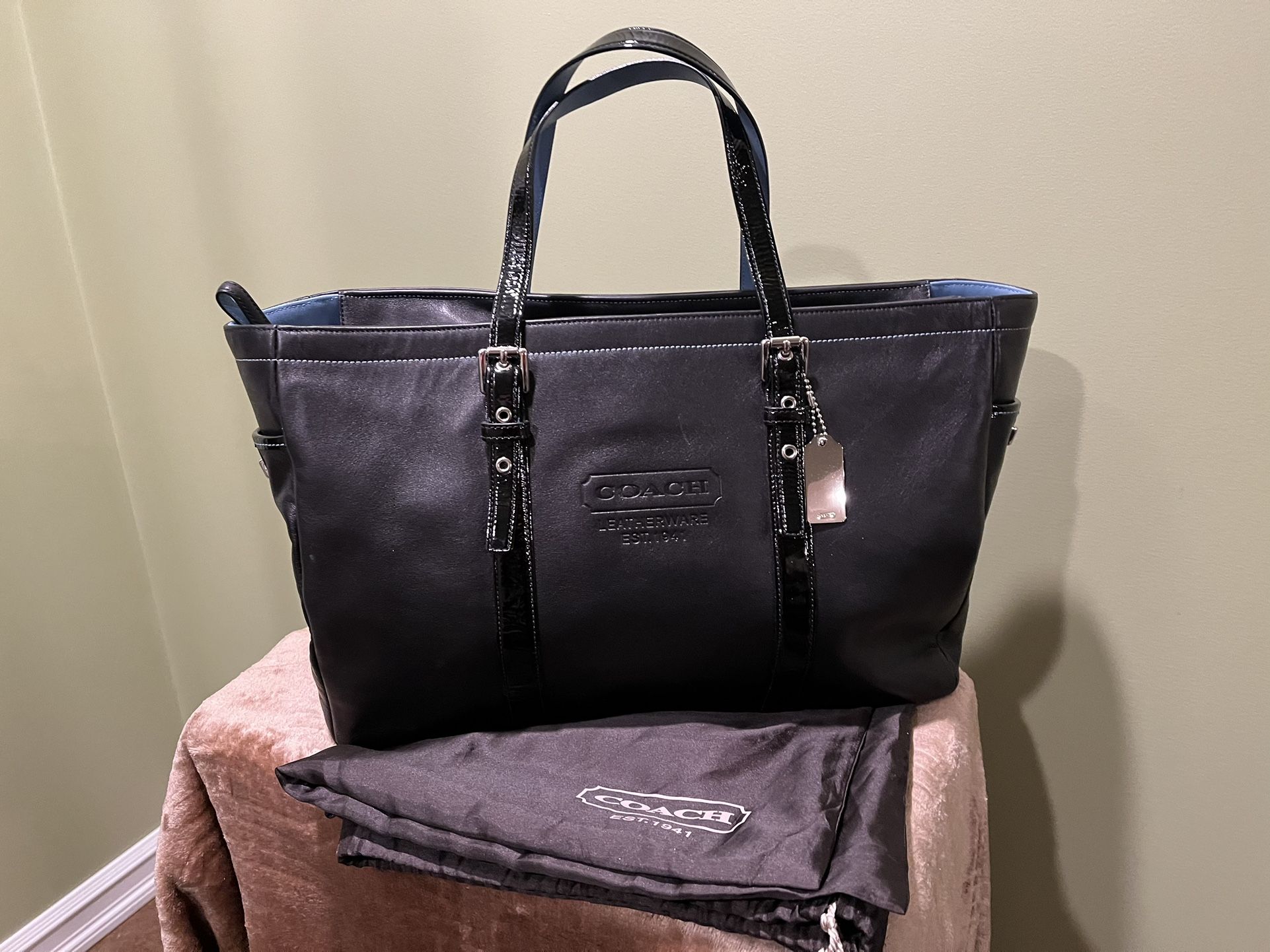 Coach black tote in very good condition. Comes from a non-smoking handbag collector. No picks, tears, stains or odors. Size is approximately 10”H x 17” W x 4-1/2” . Straps are adjustable with zipper closure. 1 inside zip pocket plus 2 other interior pockets. Two exterior pockets with turn locks. All sales are final, cash only. Local pickup only.