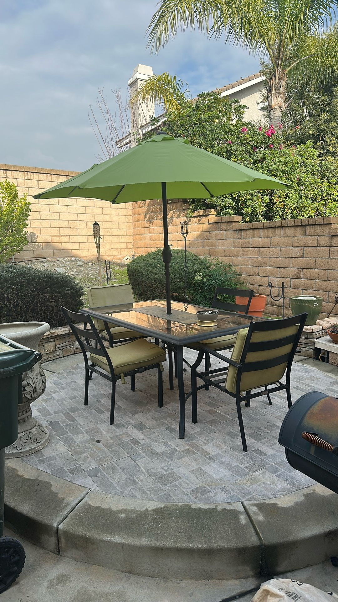 Outdoor patio set for sale with table, umbrella, and four chairs. Glass top table with green umbrella as pictured. Perfect for outdoor lounging, barbecues, wine nights, mini tiki torches, or relaxing under the sun. Great addition to a patio, backyard, or deck. Clean and ready to enjoy. Pick up only. Tags: Chairs, Dining Set, Patio Furniture, Outdoor Table, Umbrellas, Patio Set, Backyard, Lounge Table.