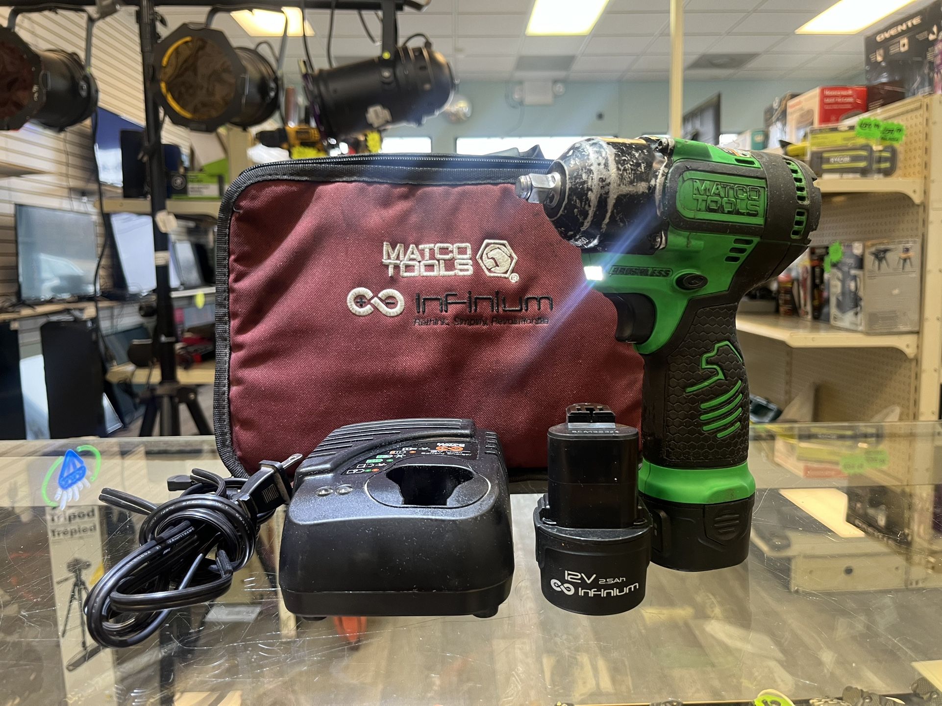 From our Yorkville Store 150 it. Ibs. of breakaway torque in a compact package make applications like fender bolts, engine covers, valve cover, and transmission pan removal an easy task - Dual element LED technology illuminates poorly lit work areas and makes working in the engine compartment an easier task • Patented impact mechanism reduces vibration making the tool easier to work with for extended time periods • Matco INFINiUM brushless motor series provides more torque and run time per battery charge making the technician more productive and less downtime • At less than 6 in overall length, this tool is able to fit into tight places with the freedom of no air hose - Kit includes one 2.0 Ah lithium-ion battery with an onboard fuel gauge: 12V charger and soft side carrier bag