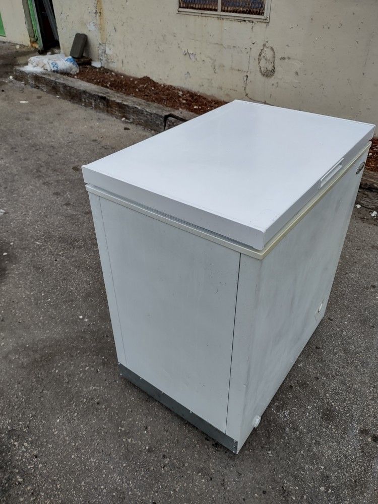 Hi I am Fred I have 5.0 Cú ft chest freezer excellent working conditions barely used English Portuguese and Spanish Dimensions W= 28.5. H=33
