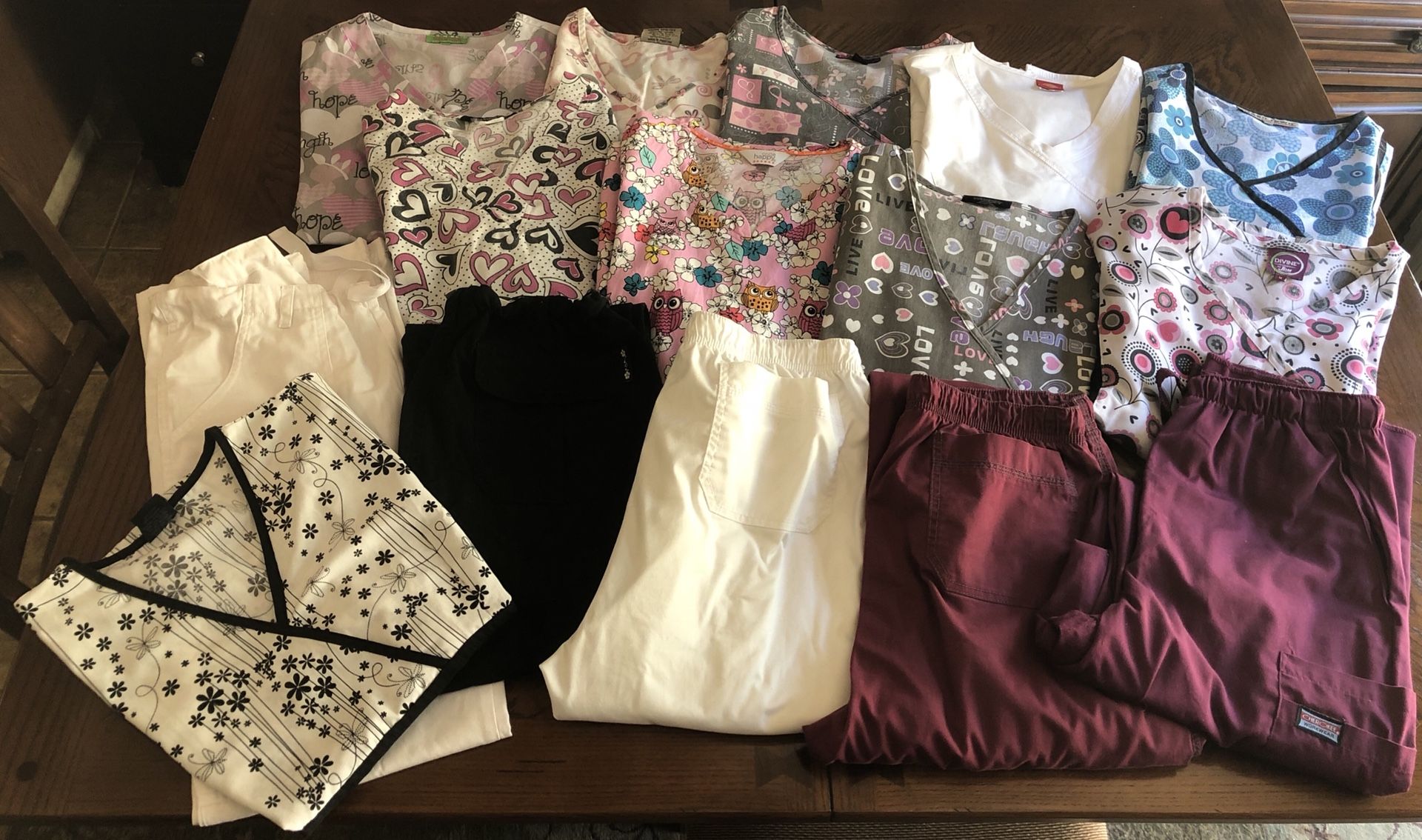 10 tops, medium & Large 5 pants all talls , 2 small 3 medium I live in Prather but work in town, I can meet in Fresno or Clovis