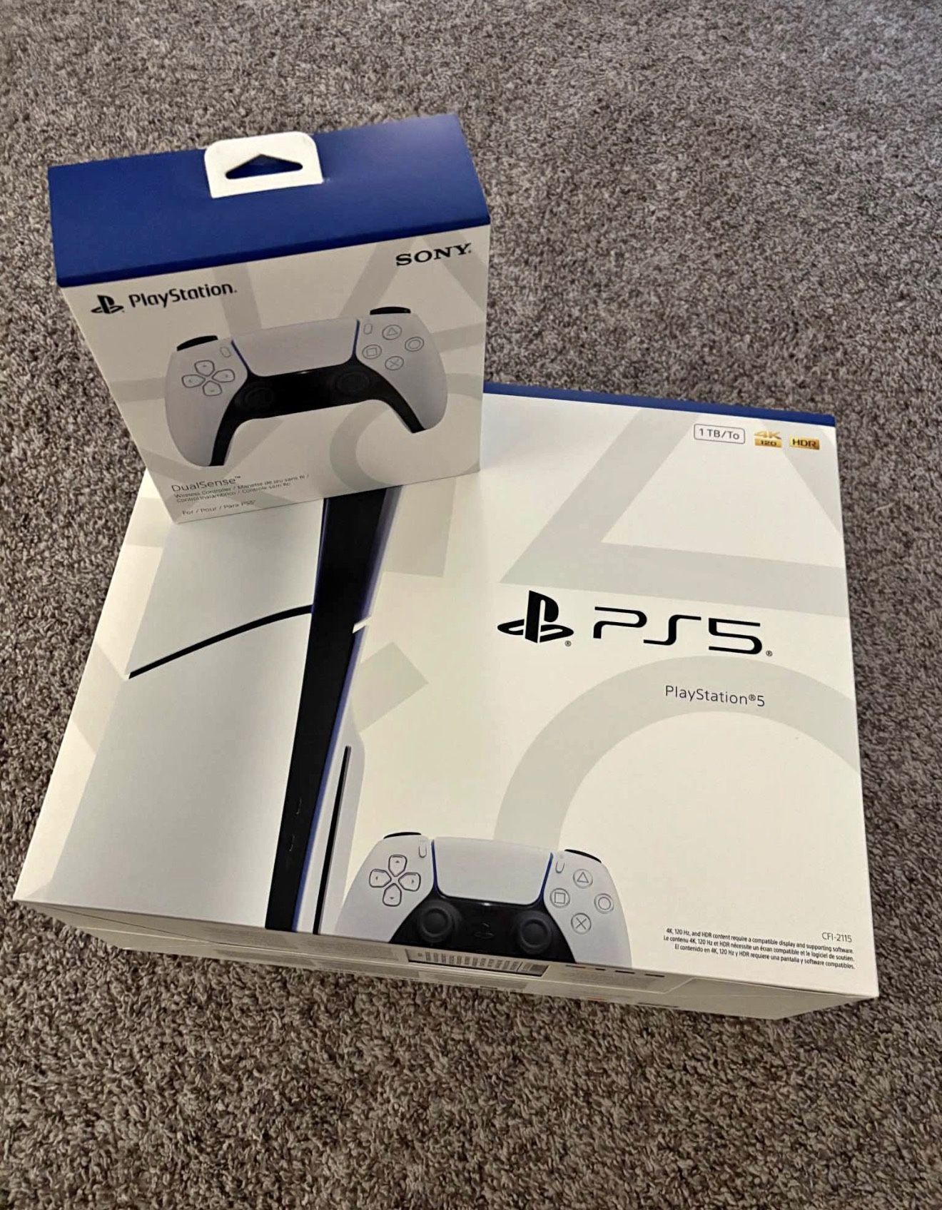 BRAND NEW IN BOX!!! NEVER OPENED!!! PS5 Slim disc and 1TB. Comes with Extra Dual Sense controller that is all unopened. Selling for $550