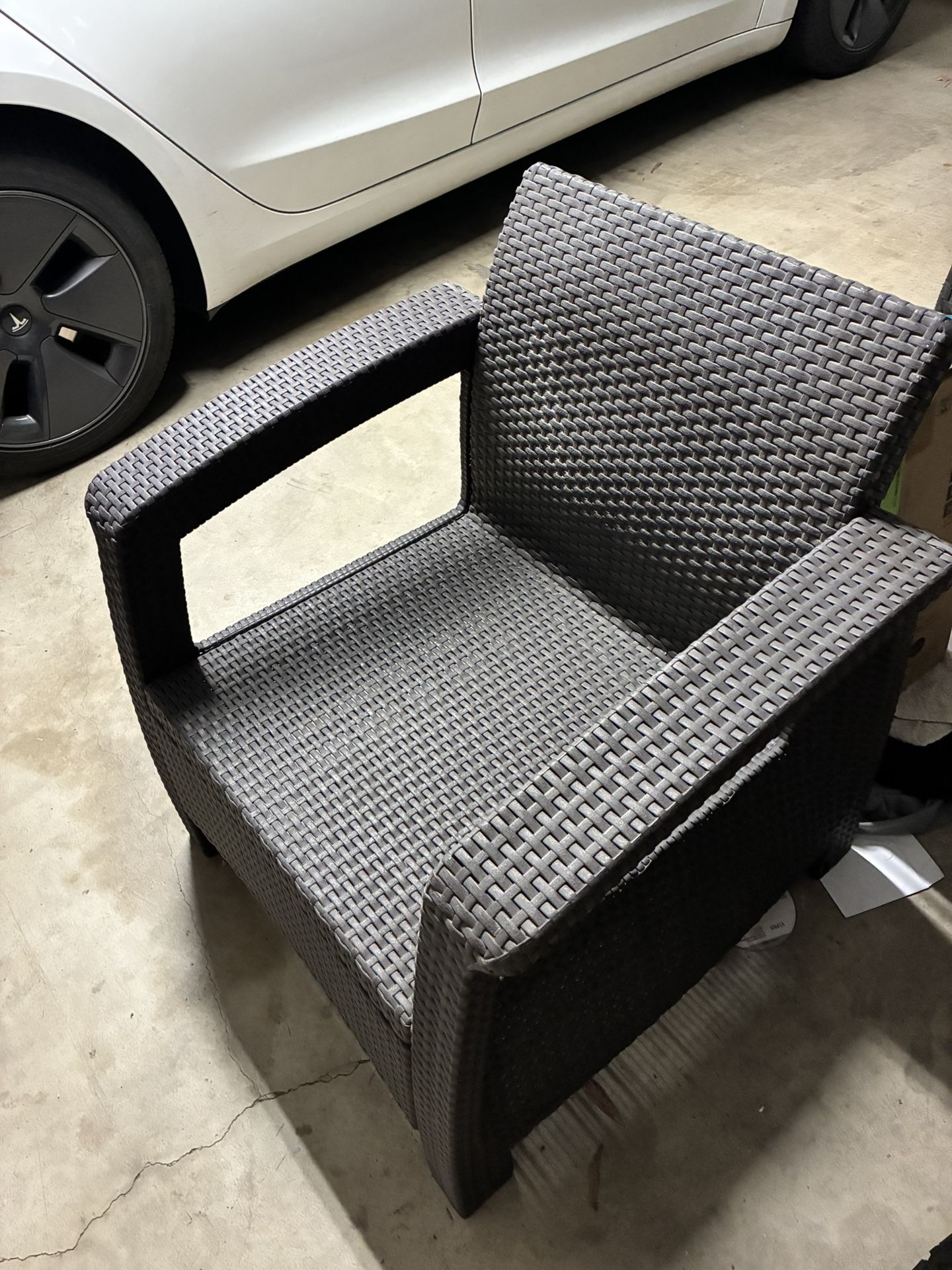 Faux Rattan Outdoors chair for sale, used condition Dimensions are 29”W x 28”D x 31”H New one sold for almost $200