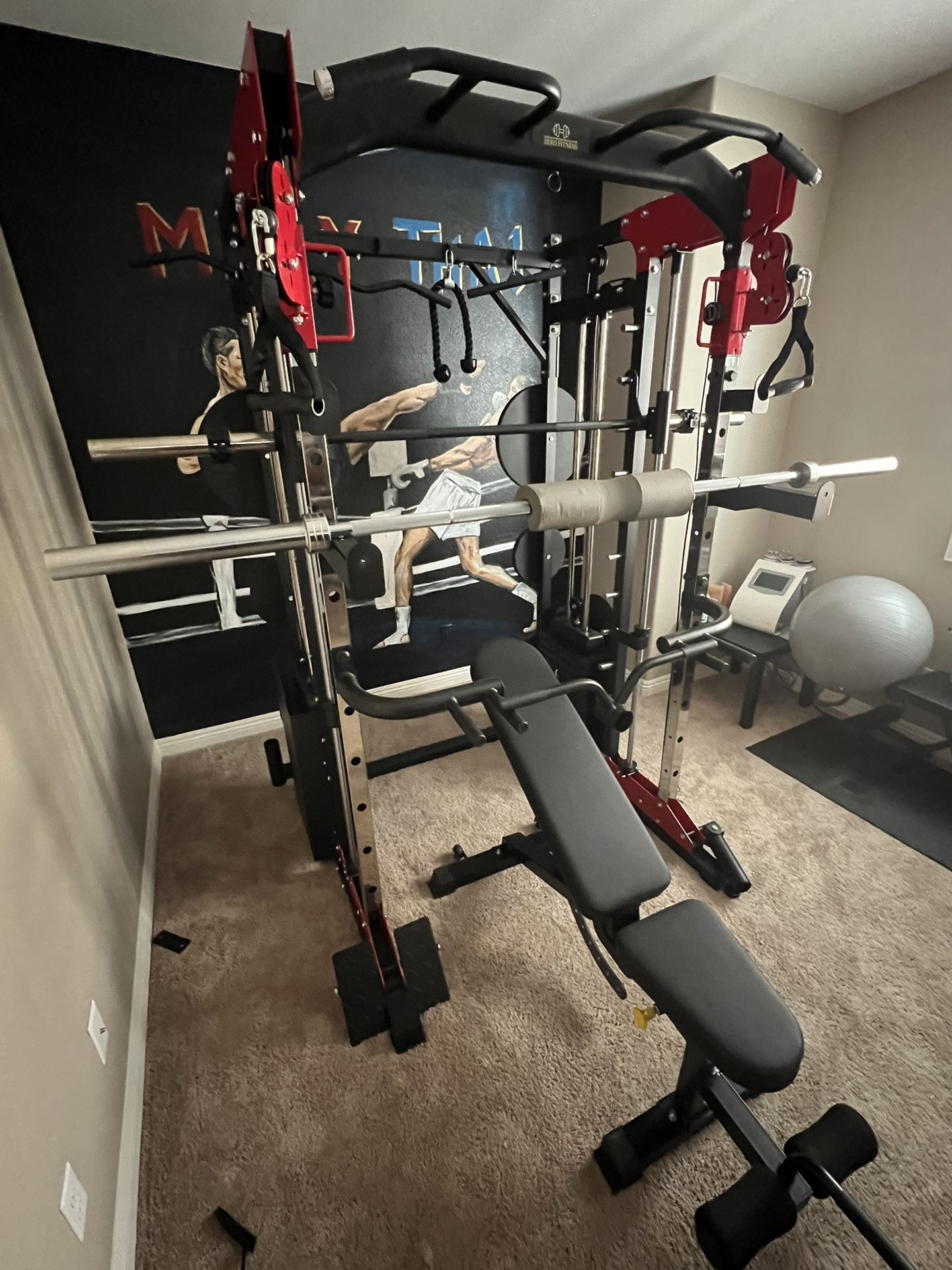 🔥SM200 Smith Machine Bundle Package 150lbs x 2 weight stacks (300lbs weight stack total)❗️❗️❗️ 👉290lbs Olympic Weights: Pair of each: 45 lbs,35 lbs, 25 lbs, 10 lbs, 5 lbs & 2.5 lbs + 45lbs 7Ft Olympic Bar Adjustable Bench From Decline all the way to upright . 👉660lbs Weight Rating Smith Machine + Functional Trainer Other Features: 👉Land Mine, Back Row Station , 4 Plate storage pegs. Attachments: Lat pull-down bar, straight bar, Tricep rope , Land Mine Dimensions: (Base) L 54”, W 49” H 86” With Smith Bar & Free Bar, Allow a total of 7ft total width space. Back of the machine: Allow + 8” in. Weight Plate Storage WARRANTY: LIMITED LIFETIME WARRANTY🔥🔥❗️❗️❗️❗️. Frame & Parts