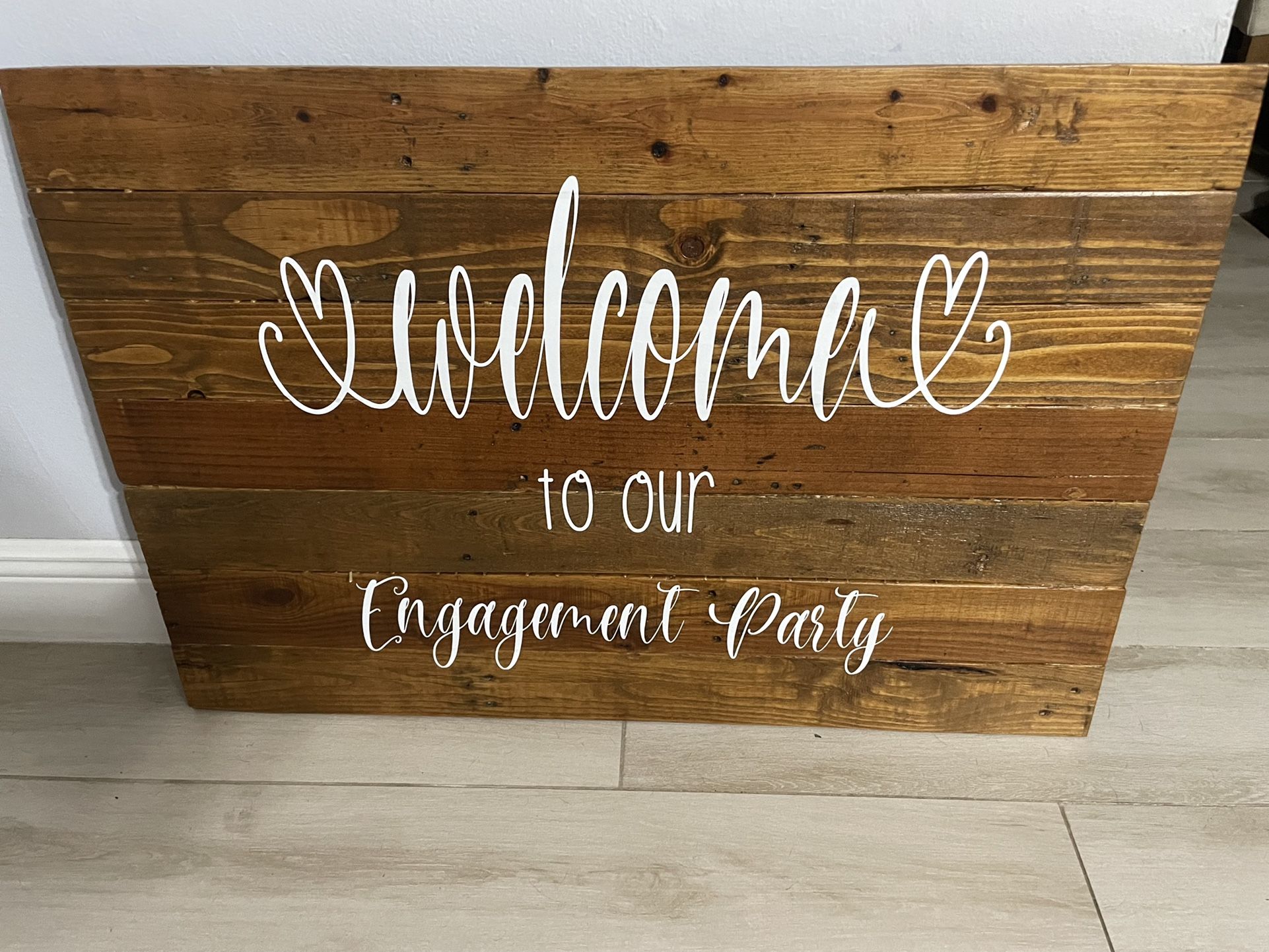 Welcome to our Engagement Party sign, 35” w x 24” h. Made of stained wood and vinyl with polycrylic.