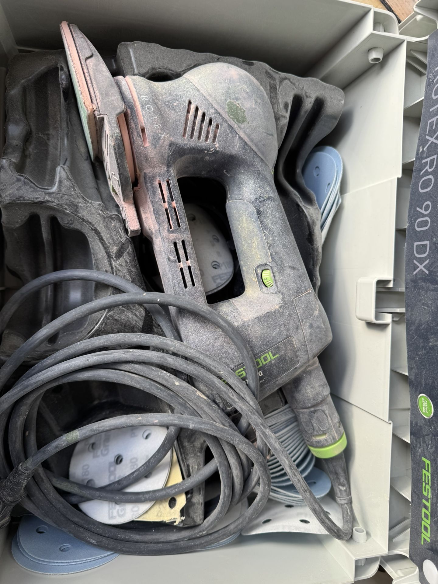 Festool RO 90 Rotex sander — compact, powerful, and extremely versatile. Ideal for detail sanding, edge work, trim, doors, and tight areas. Gear-driven mode removes material fast; finish mode leaves a clean surface. • Rotex (gear-driven) + random orbit modes • Excellent dust extraction when paired with Festool vac • Smooth, balanced, no vibration issues • Lightly used, fully functional Professional tool, not homeowner grade.