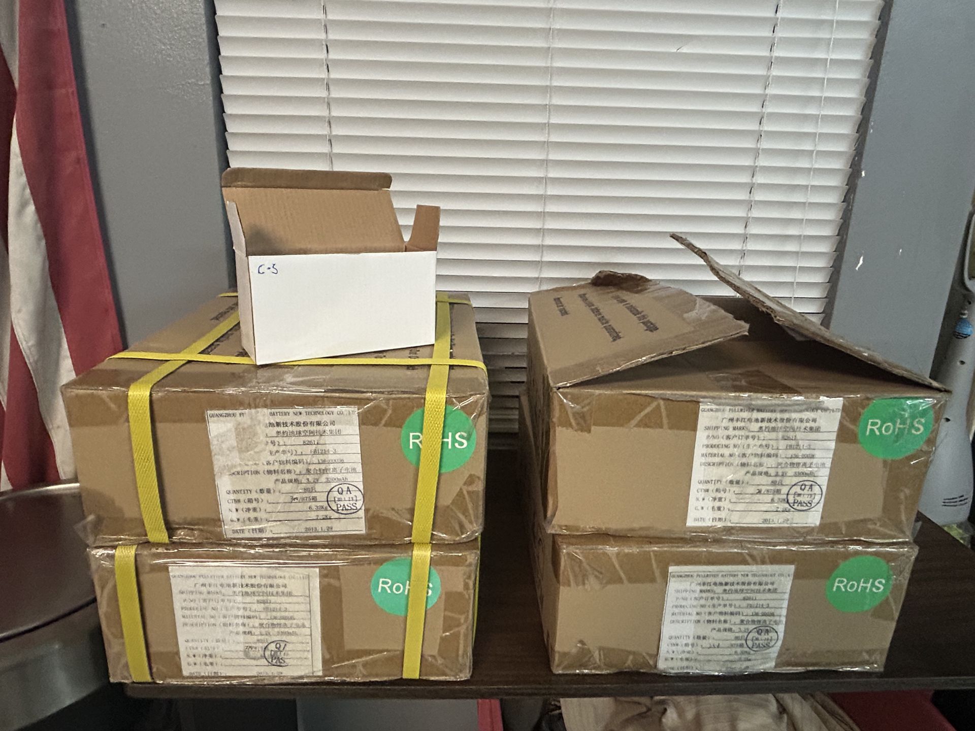 3.5 boxes worth of 3.2 V, 3300 mAh lithium ion batteries (289 total). Must be charged.