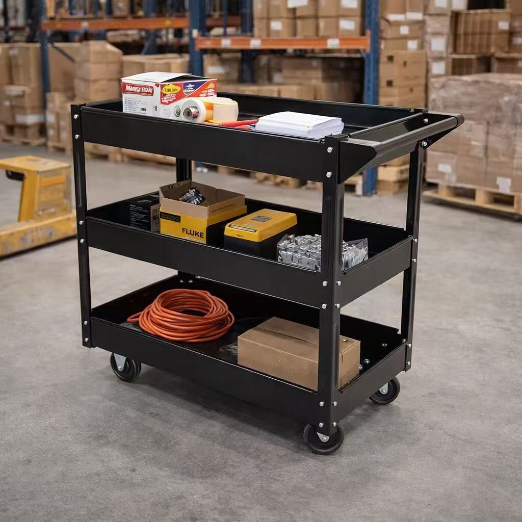 New In Box 30x16x31 Inch Tall 3 Tiers Rolling Metal Push Cart Dolly For Tools Cleaning Supply Warehouse Office Organizer Dolly