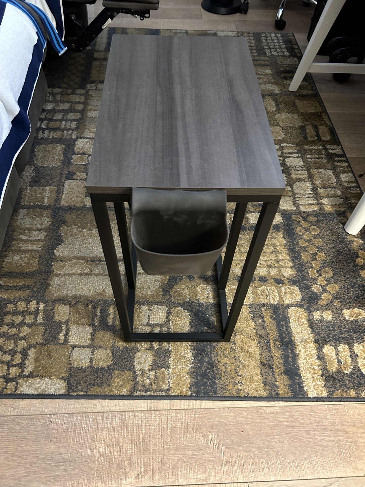 Easy to slip in between you and the couch. For drinks or to put your snacks on. Dark wood (espresso color with black metal legs). Clean and well kept.