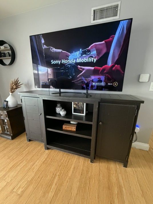 Solid dark wood entertainment center with storage cabinets and shelves. Great for a living room, apartment, or game room. Fits large TVs and has plenty of space for media devices, consoles, routers, or décor. Features: • 64 inches wide • ~39 inches tall • Open center shelving for cable box, gaming systems, or soundbar • Two side cabinets for hidden storage • Cable management hole in the back • Sturdy construction Condition: Used with some cosmetic wear (see photos). Scratches and scuffs mostly on the bottom edges from normal use, but it’s still very solid and looks great once the TV is on it. TV and other items shown in photos are not included. Dimensions Width: 64 inches Height: 39 inches Depth: approx 18–20 inches Pickup only. First come first served. If the post is up, it’s available. Ignore tags: TV stand Entertainment center Media console Living room furniture Cabinet storage Game console stand