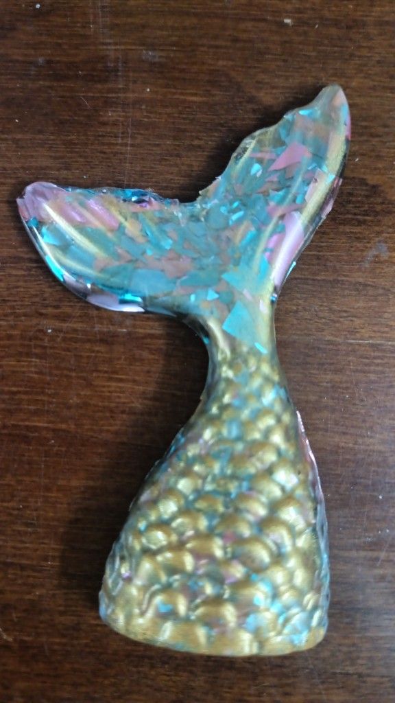 This is a one of a kind handmade gold epoxy resin mermaid tail with blue and silver glitter. It's perfect for those who love fantasy or mermaids. The tail has a small flaw on the back caused by an air bubble while the resin was curing, but it's in otherwise great condition and can still be displayed properly. This tail stands at 3" tall from the bottom of the tail, to the top.