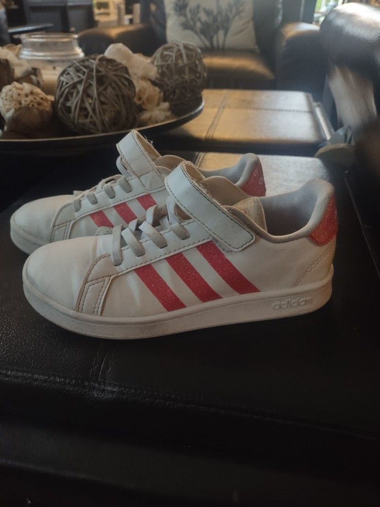 Size 13 1/2 little girls Adidas shoes.. The shoelaces could use a little bleach but for the most part they in good condition.