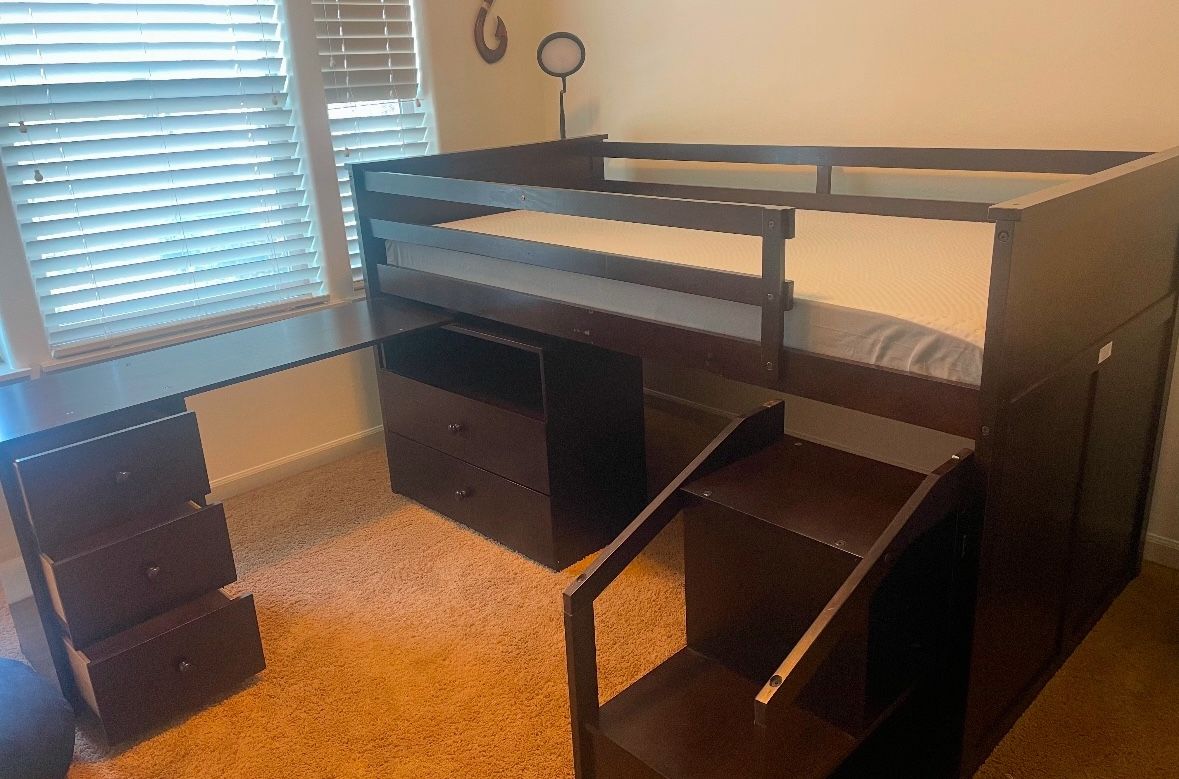 Emryck twin loft bed with stairs, drawers and desk. Comes with a Zinus memory foam twin mattress and cover. Barely used purchased 1.5 yrs ago from Wayfair. My son wanted a bigger bed so this set is ready for its new home! Dismantled and ready to go! Bed and mattress $150 Located in SE near Happy Valley, must pick op.