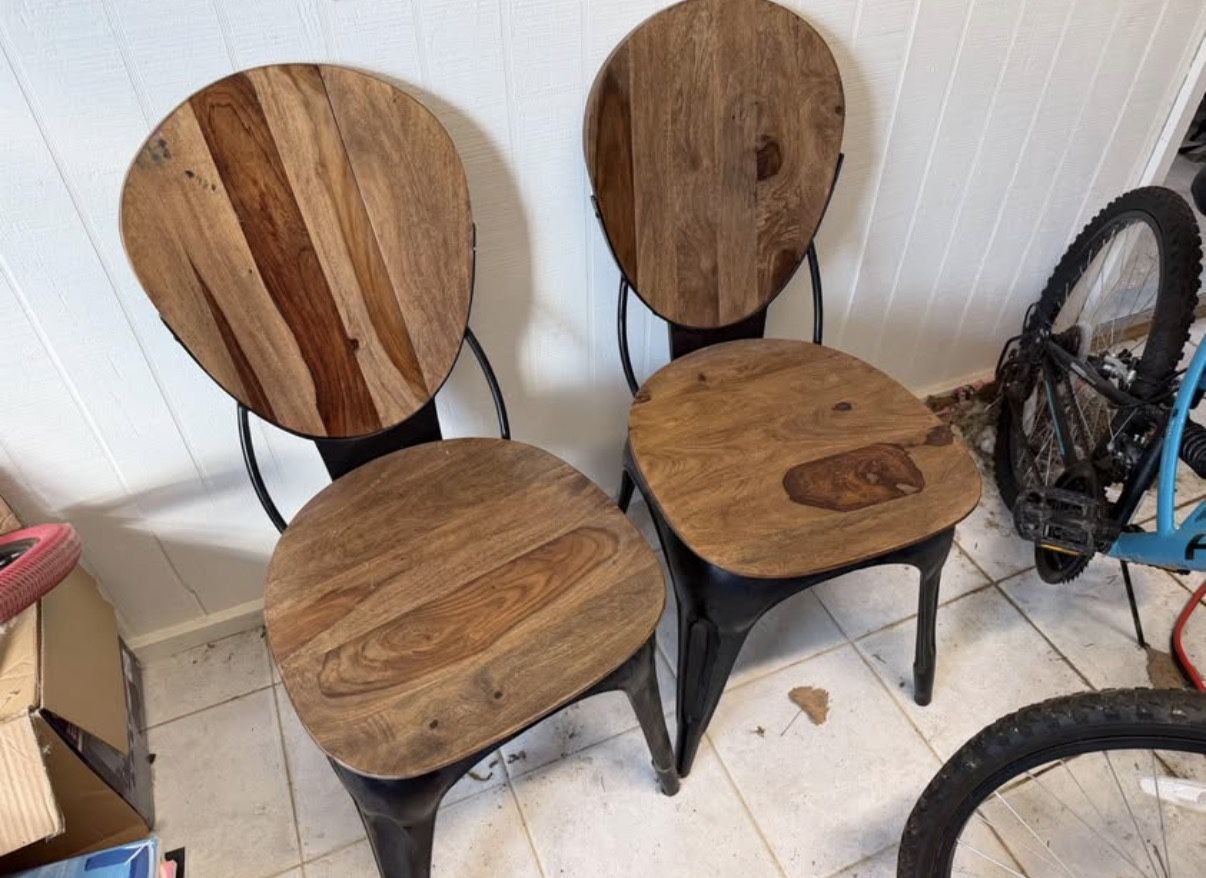 Set of 4 industrial-style chairs with solid wood seats & backs and metal frames. Sturdy, unique wood grain — great for dining table, kitchen, or accent seating. Good condition with natural character in the wood.