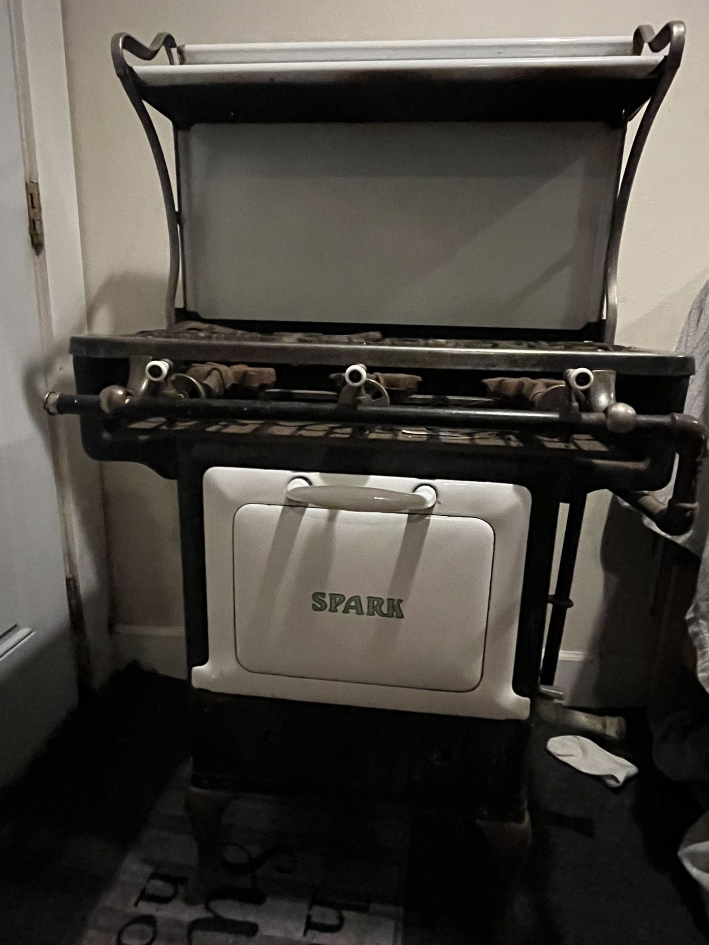 Super Cute antique 3 burner stove. This stove runs off of propane, all components are here including the oven racks. I haven’t fired it up but it should work. I salvaged it from a demolition project and I was told that it is from the 1920’s. The word “Spark” on the oven door.